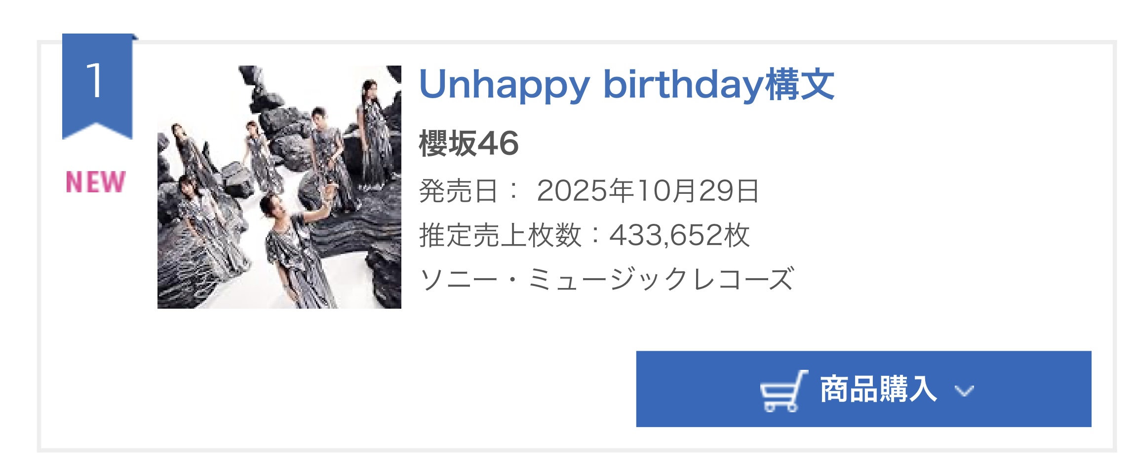 ยอดขาย Sakurazaka46 13th Single「Unhappy birthday Koubun」Oricon Chart วันแรก