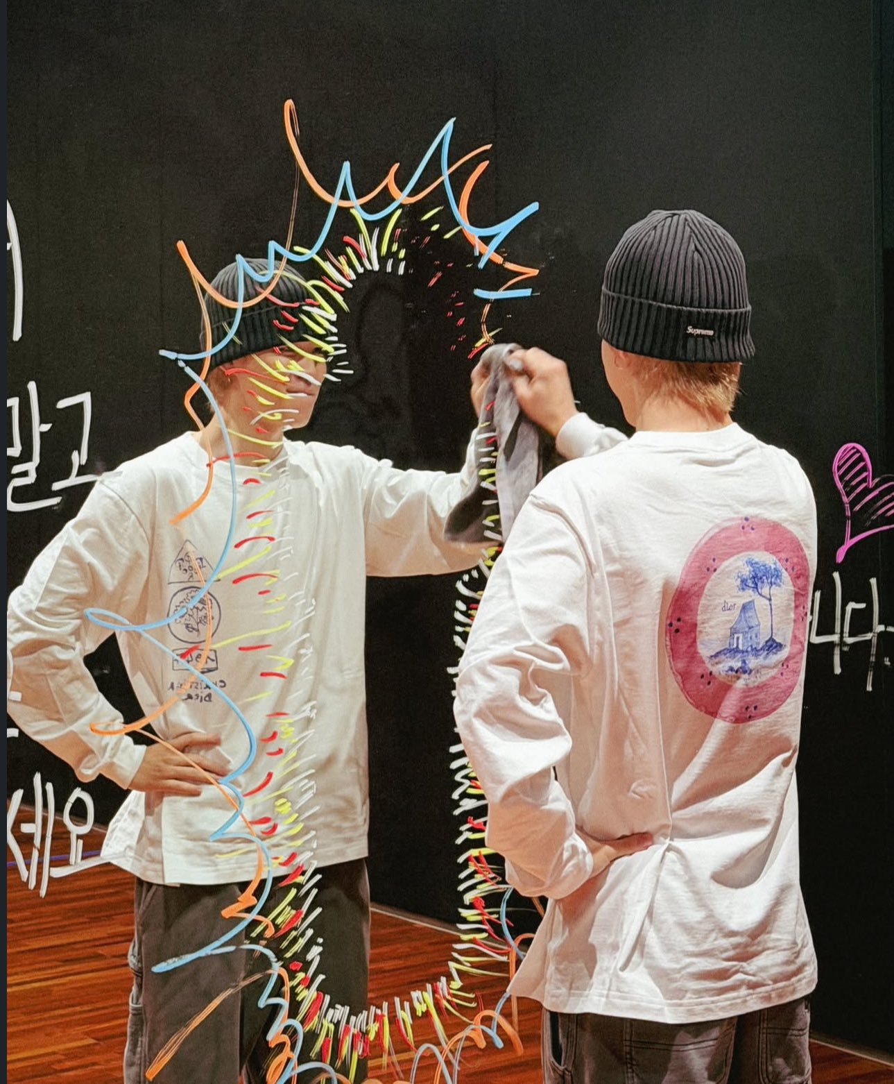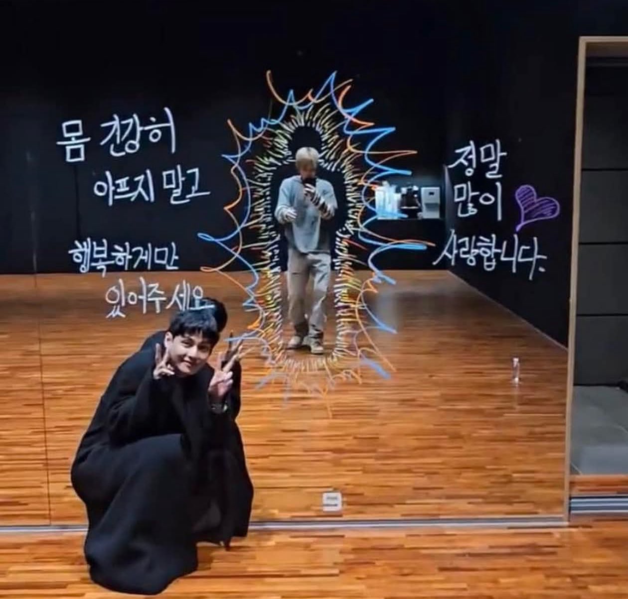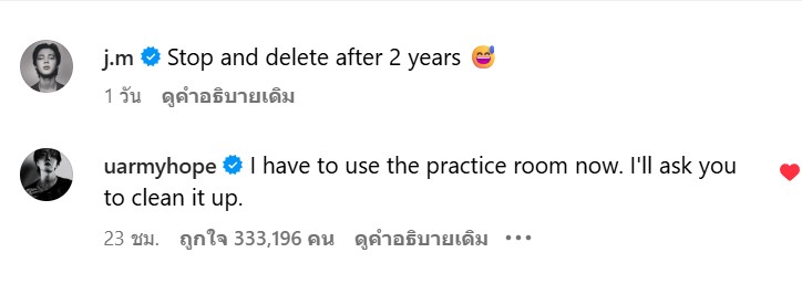 เจโฮป มาคอมเมนต์ในโพสต์อินสตาแกรมของจีมินว่า: "ก็ไหนๆ เราจะต้องใช้ห้องซ้อมแล้วตั้งแต่ตอนนี้ ก็ช่วยทำความสะอาดให้เรียบร้อย น่ารักๆ เลยนะ~" (พูดแบบน่ารักๆ)
