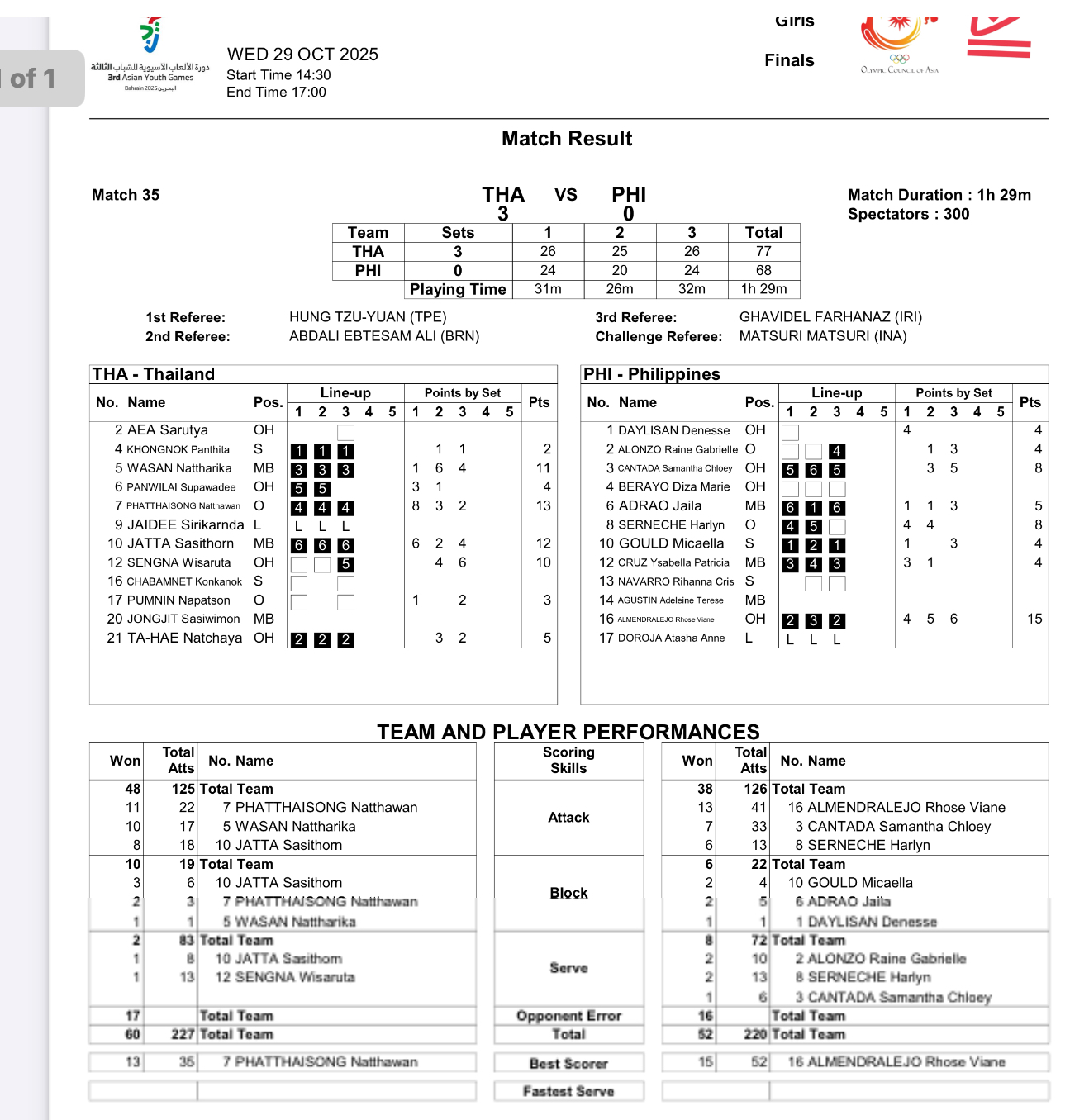 สถิติ Thailand🇹🇭3-0Philippines🇵🇭 คว้าเหรียญทองแดง Asian Youth Games | ไอซ์ณัฐวรรณท็อปสกอร์13คะแนน