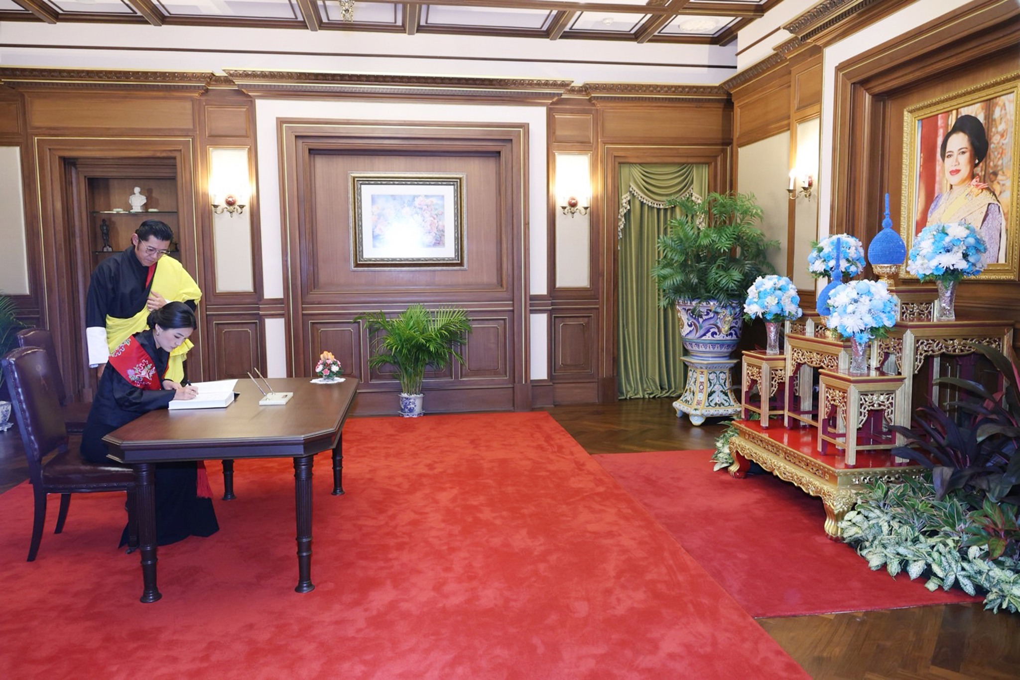 เมื่อวันที่ 29 ต.ค. 2568 เวลา 10.00 น. สมเด็จพระราชาธิบดี จิกมี เคเซอร์ นัมเกล วังชุก แห่งราชอาณาจักรภูฏาน เสด็จพระราชดำเนินพร้อมด้วยสมเด็จพระราชินีเจตซุน เพมา วังชุก มาทรงวางพวงมาลาถวายราชสักการะหน้าพระโกศพระบรมศพ สมเด็จพระนางเจ้าสิริกิติ์ พระบรมราชินีนาถ พระบรมราชชนนีพันปีหลวง ณ พระที่นั่งดุสิตมหาปราสาท พระบรมมหาราชวัง พร้อมทั้งทรงลงพระปรมาภิไธย และพระนามาภิไธย ถวายความอาลัย