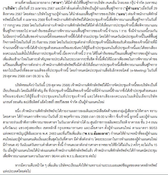 แจ้งมติสำคัญของที่ประชุมเจ้าหนี้ในคดีฟื้นฟูกิจการของบริษัท เจเคเอ็น โกลบอล กรุ๊ป จำกัด (มหาชน)