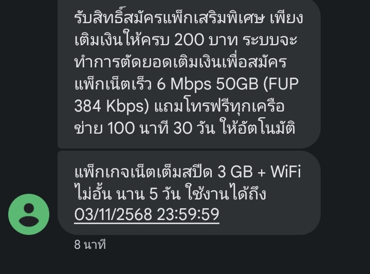 มีsmsมาให้สิทธิ์1ครั้งกด*888*10#เน็ต15วัน50฿ ,พอเติมเงินไปรวมประมาณ70฿ล่าสุด กดตามที่ข้อความมาต้องการเสียแึ่50฿ แต่ระบบไม่หักไม่ตัด รอจนsmsโฆษณาเสียเงินเข้ามาทุกครั้งที่เติมเงิน กดยกเลิกบ่อยมากแต่เหมื