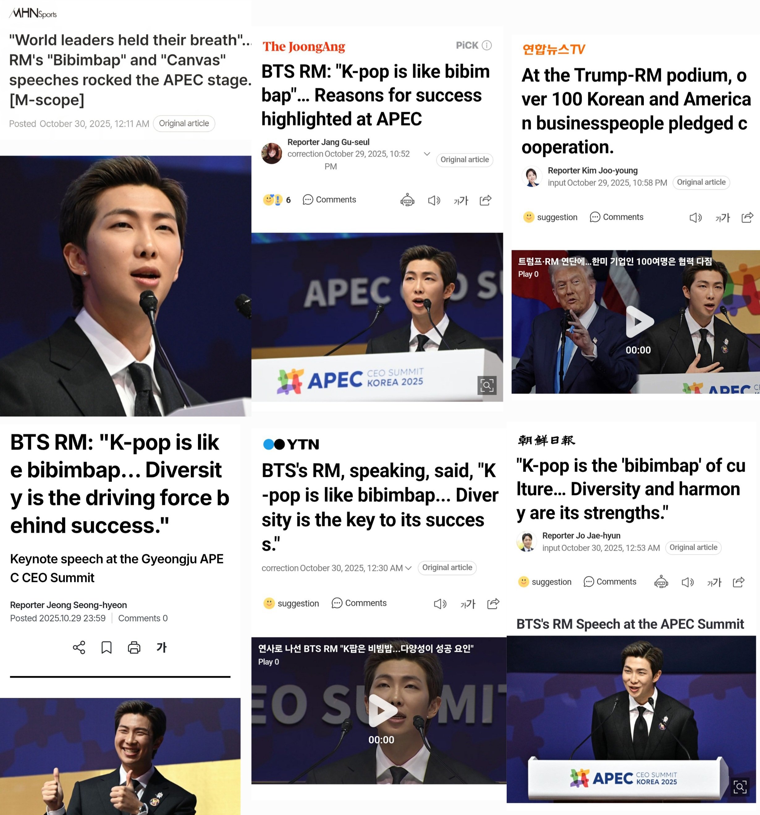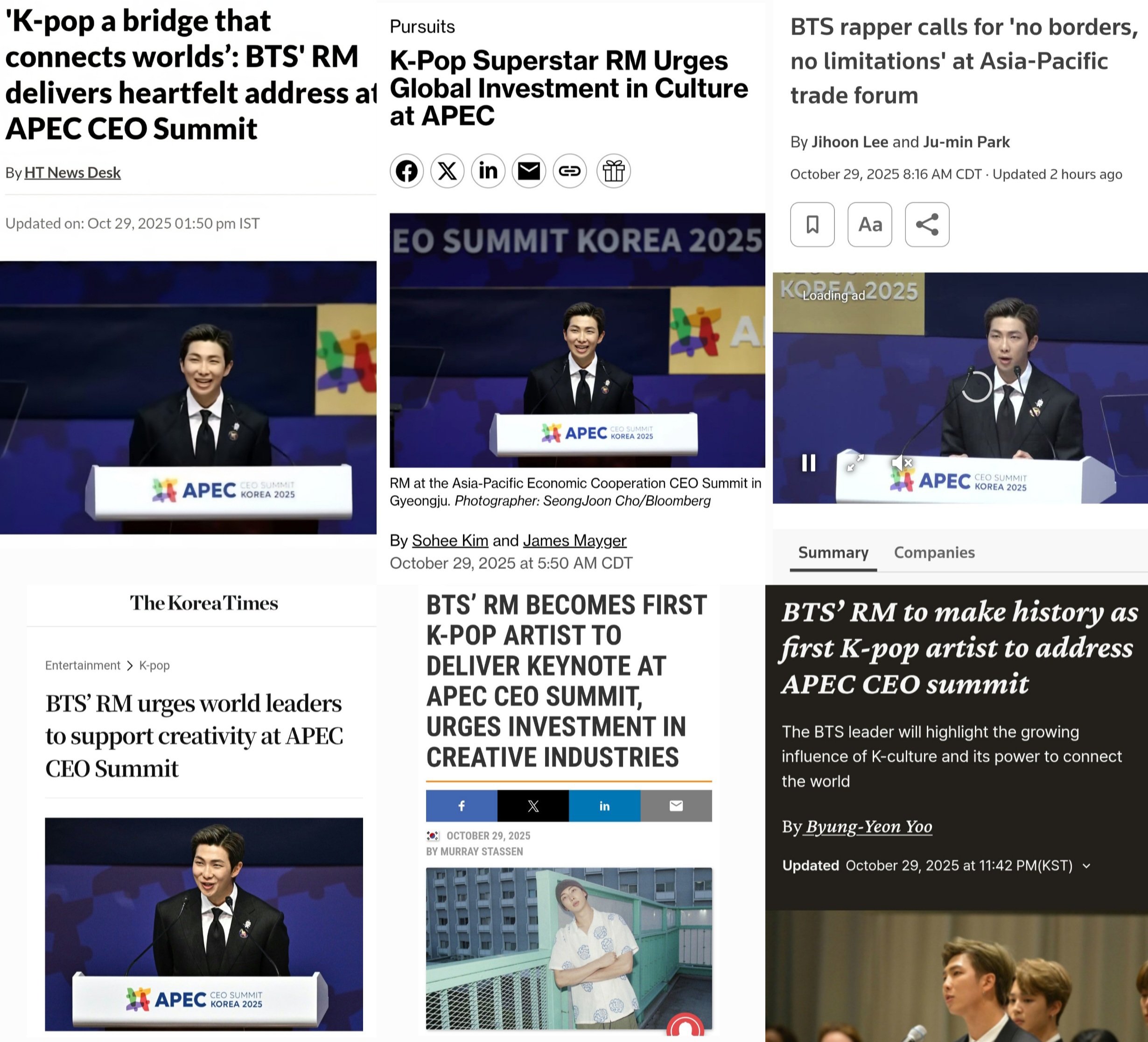 สถานที่ที่เคยเงียบสงบกลับเต็มไปด้วยเสียงเชียร์อย่างกะทันหัน เมื่อ RM (คิม นัมจุน) หัวหน้าวง BTS ปรากฏตัวบนเวทีในงาน '2025 Asia -Pacific Economic Cooperation ( APEC ) CEO Summit' ซึ่งจัดขึ้นที่ศูนย์ศิลปะคยองจูในคยองซังบุกโด เมื่อวันที่ 29