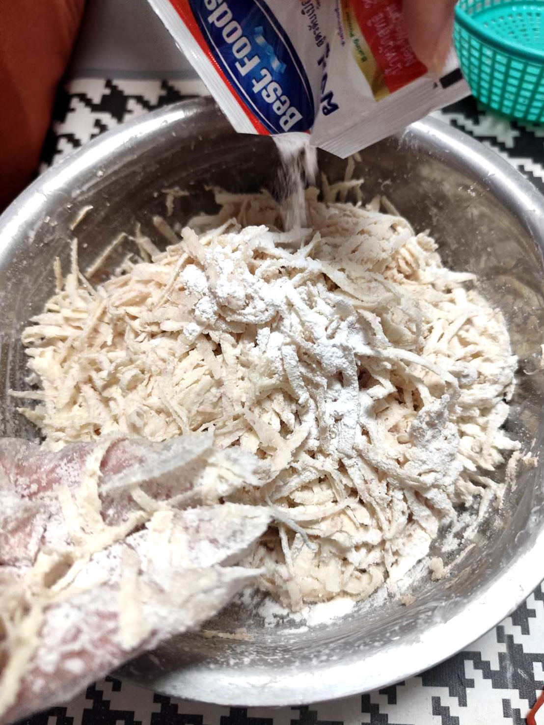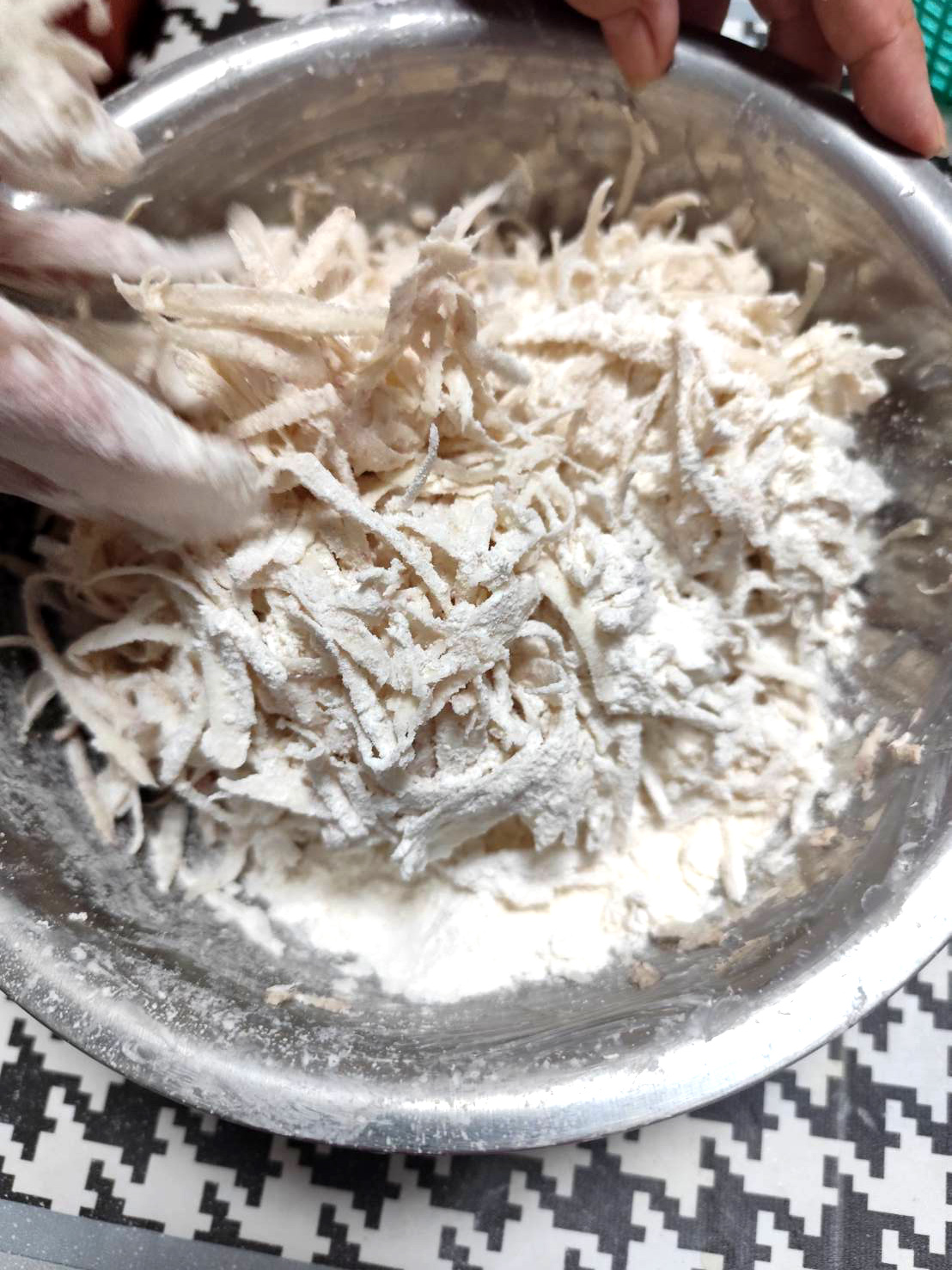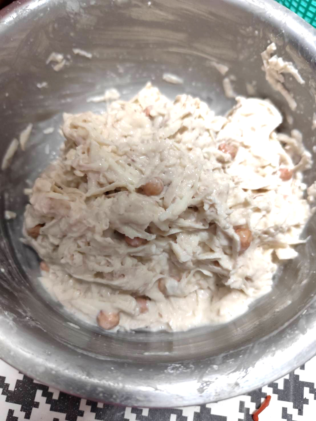 เสร็จแล้ว เผือกที่ผสมใส่แป้ง พร้อมทอดแล้วค่ะ