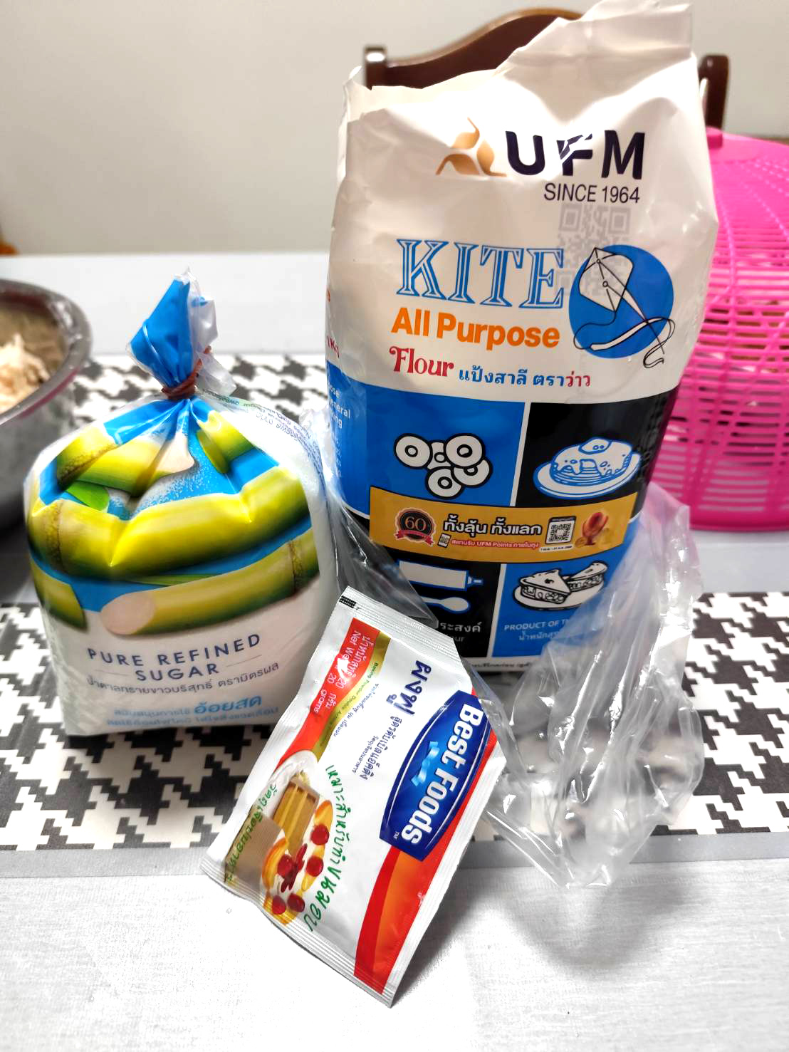 แป้งสาลีอเนกประสงค์, เกลือ, น้ำตาลทรายขาว, ผงฟู, ถั่วลิสง ใช้แค่นี้ในการผสมทั้งเผือก และข้าวโพด