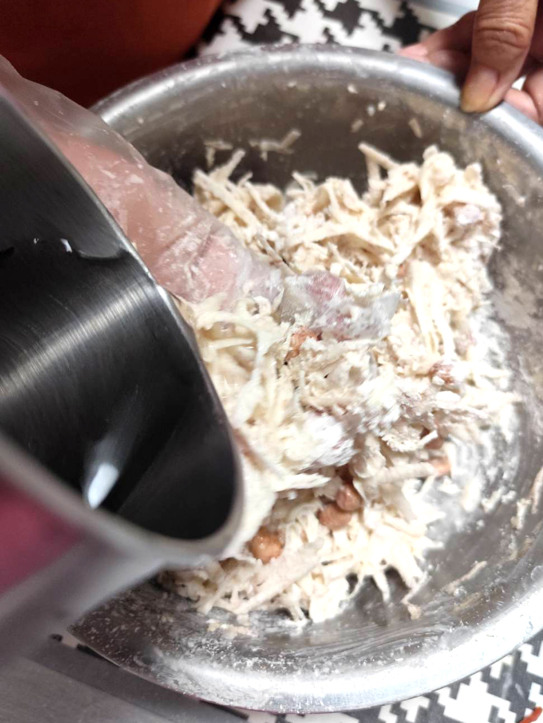 เผือกที่ผสมแล้ว เราจะไม่ใส่น้ำเยอะจนเกินไป เพราะถ้าน้ำเยอะเวลาทอดเผือกจะแตก และไม่อร่อย