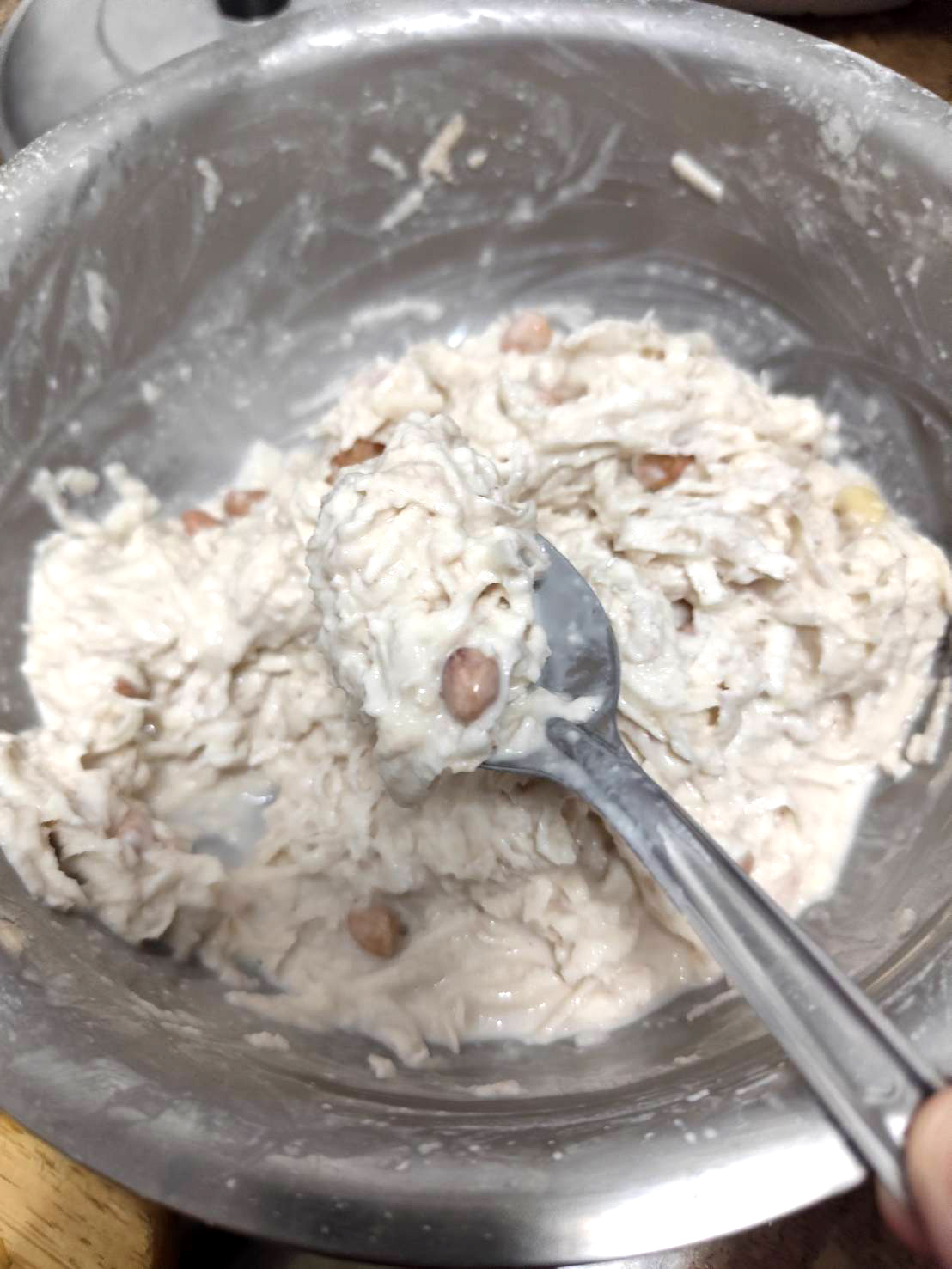 การผสม เหมือนเผือกเลย และจะไม่ใส่น้ำเยอะ พอผสมเสร็จแล้ว จะเป็นแบบนี้เลย
