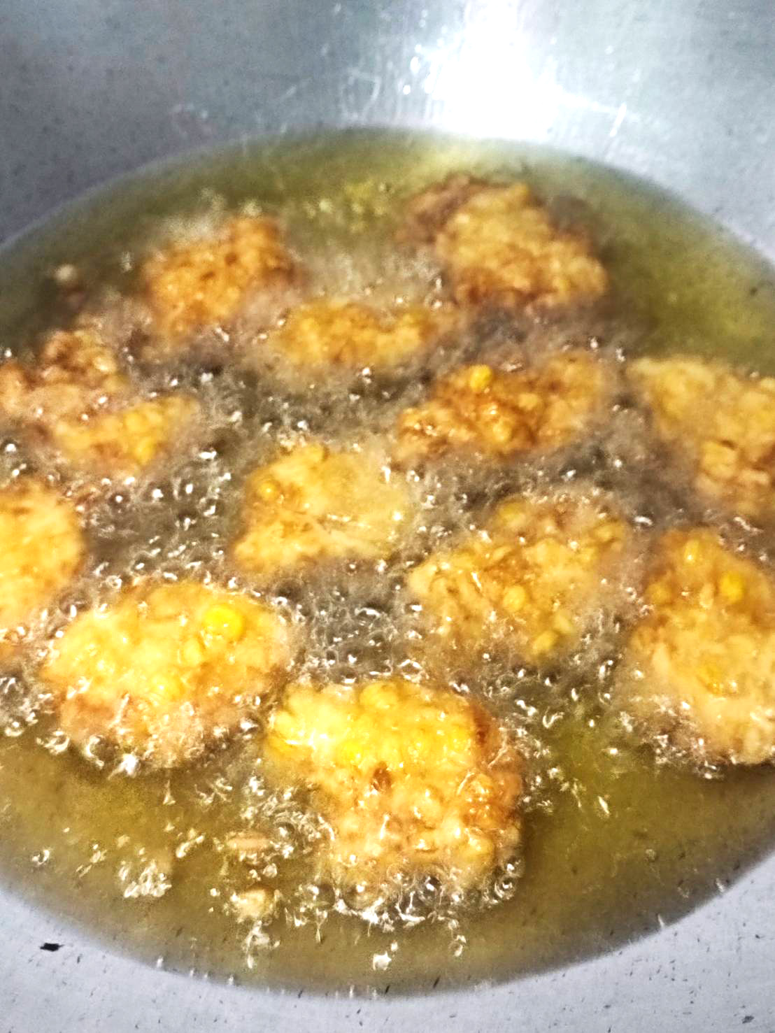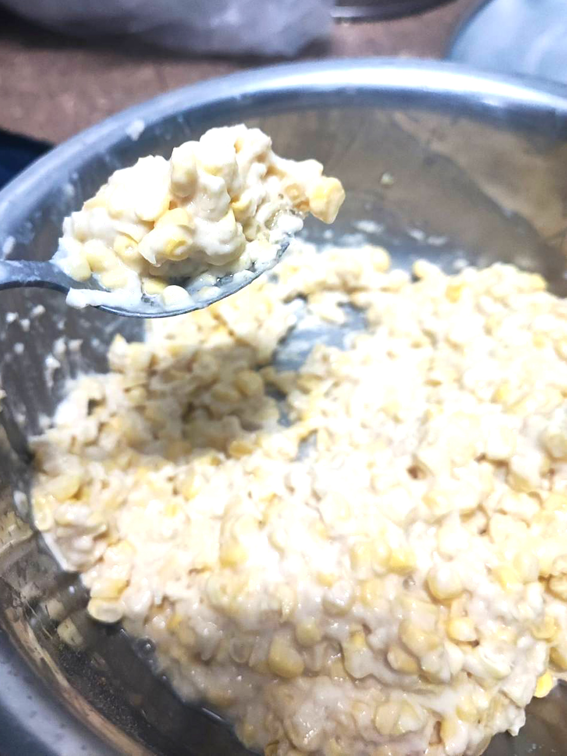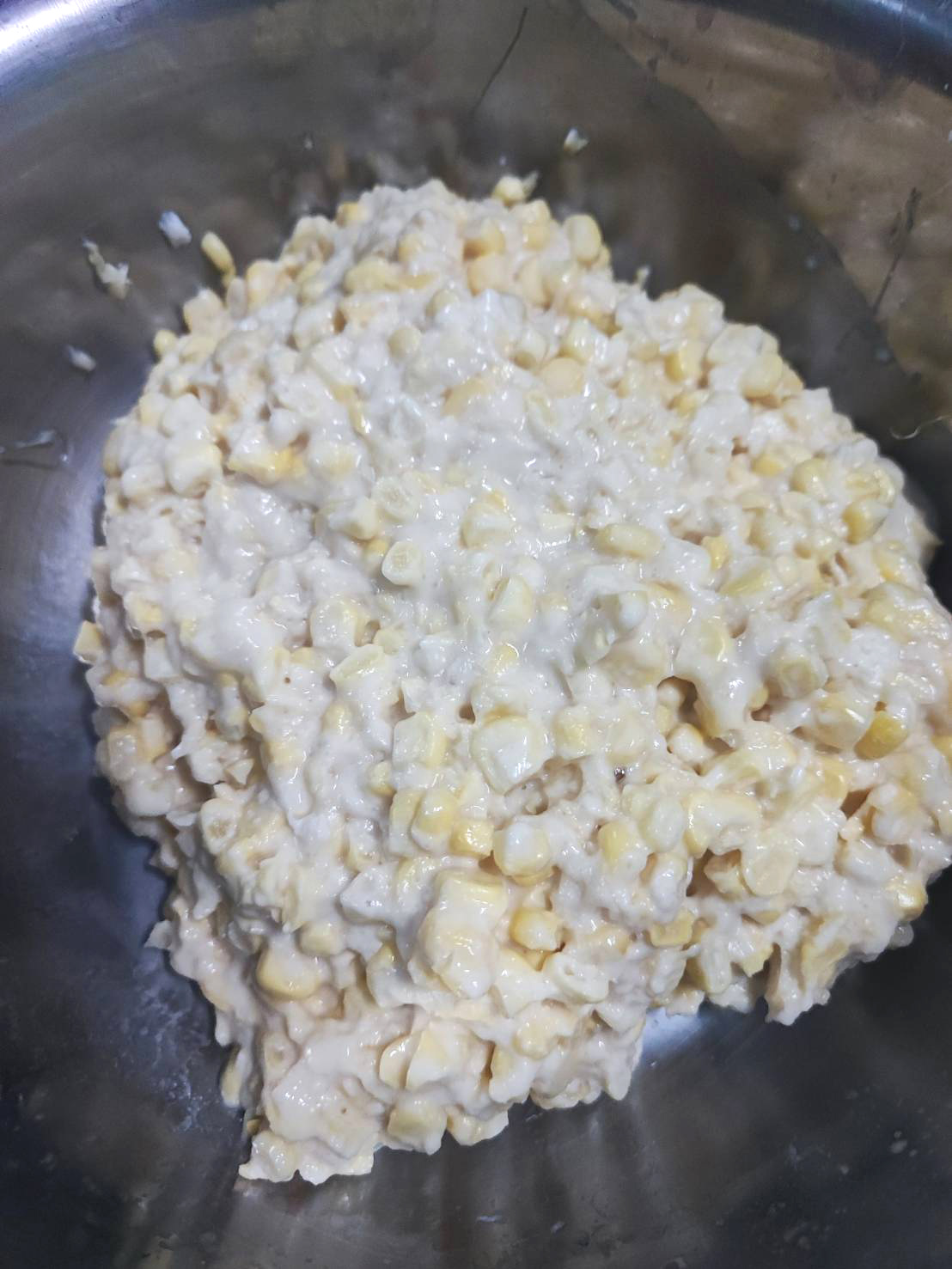 ตักข้าวโพด 1 ช้อน เอาลงในกระทะแล้วกดนิดนึงให้ข้าวโพดแบน และเป็นก้อน