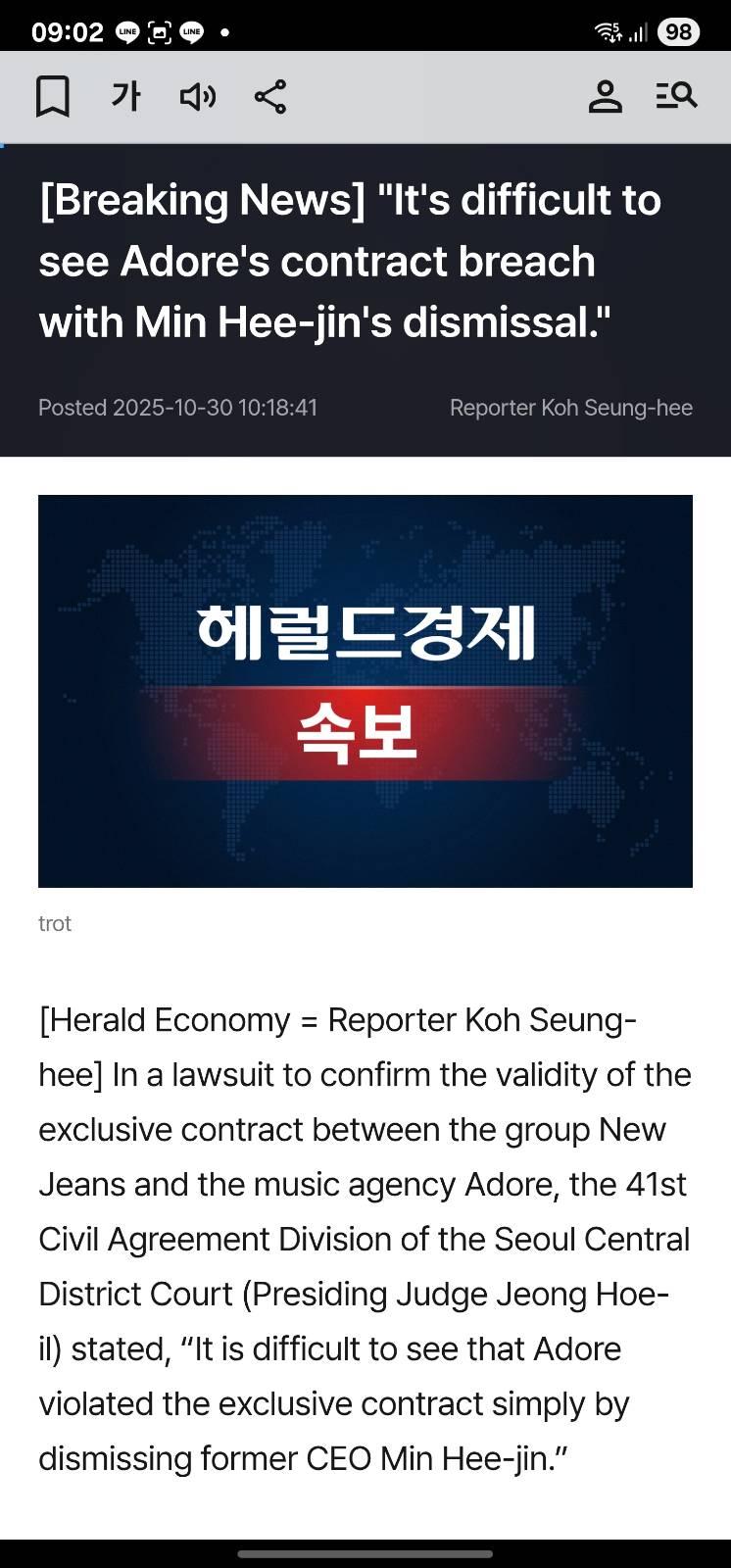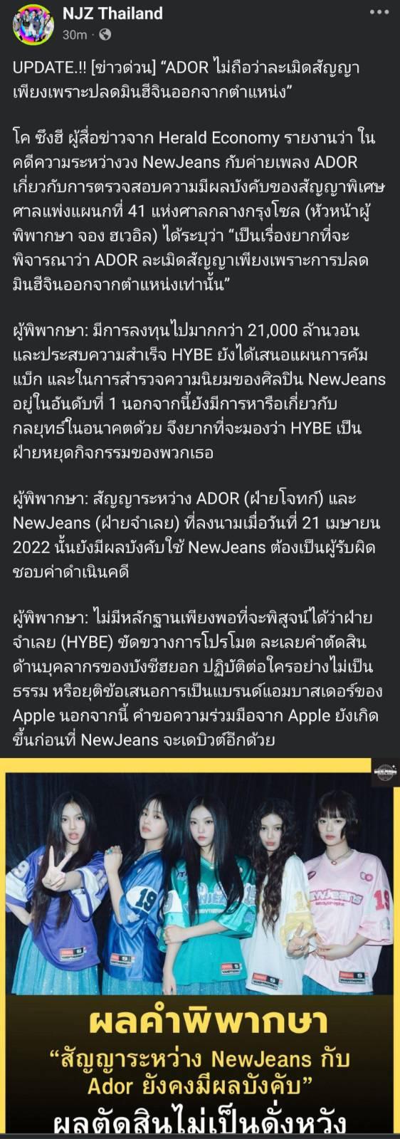 ศาลเห็นว่าค่ายไม่ได้ทำการละเมิดสัญญา เพียงเพราะแค่ปลดมินฮีจินออกไป ส่งผลให้สัญญาระหว่าง Newjeans และ Ador ยังคงมีผลต่อไป