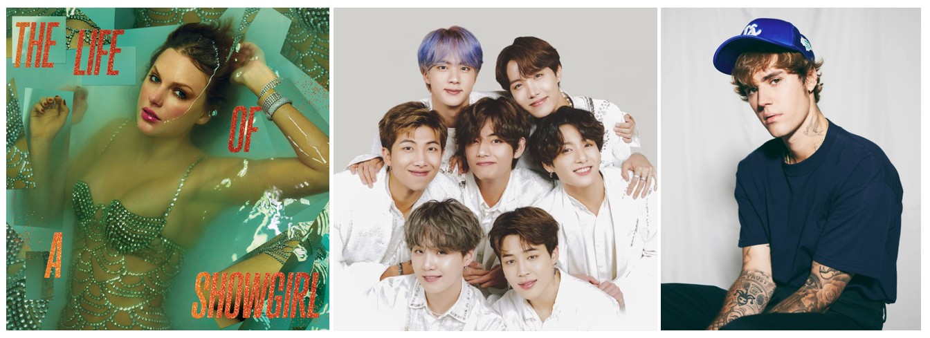 evermore และเพลง "willow" และล่าสุดกับอัลบั้ม "The Life of a Showgirl" ซึ่งเปิดตัวที่อันดับ 1 ในทั้งสองชาร์ตพร้อมกันเมื่อวันที่ 18 ตุลาคม 2025)