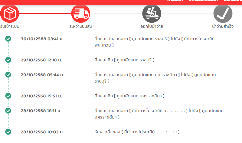 เราไปส่งของวันที่ 28/10/68 ตอนเวลา 10.00 น. กะว่าของคงจะได้เดินทางออกจากต้นทางที่รับฝากช่วงเที่ยง และเดินทางออกจากศูนย์จังหวัดในช่วงค่ำๆ เหมือนกับพวกขนส่งเอกชนที่เคยใช้บริการมาหลายครั้ง ซึ่งเขาจะตัดรอบการส่งช่วงเที่ยง ช่วงบ่าย สินค้าออกเร็ว แต่ปรากฏว่าเมื่อตรวจสอบพัสดุแล้ว พัสดุของเราออกจากต้นทาง 18.11 น. แปลว่าพัสดุรอเวลาอยู่ที่ต้นทาง 8 ชั่วโมง ไปถึงศูนย์คัดแยกนครราชสีมาเวาลา 19.51 น. แปลว่าใช้เวลาขนส่งอีกเกือบ 2 ชั่วโมง และผ่านกระบวนการอยู่ที่ศูนย์อีก 9 ชั่วโมง ถึงถูกส่งออกไปที่ศูนย์ราชบุรีในเวลา 05.44 น.ของวันที่ 29/10/68 แปลว่าพัสดุต้องอยู่ในนครราชสีมาเกือบ 19 ชั่วโมง จึงจะถูกส่งออกไปที่ราชบุรี และถึงราชบุรีเวลา 12.18 น.แปลว่าใช้เวลาขนส่งจากโคราชถึงราชบุรีอีกประมาณ 5 ชั่วโมง รวมแล้วก็ 24 ชั่วโมงแล้ว แต่ยัง ยังไม่ถึงปลายทาง ราชบุรีใช้เวลากับพัสดุของเราอีก 15 ชั่วโมง ก่อนที่จะส่งออกไปยังพนมทวนในเวลา 03.41 น. ของวันที่ 30/10/68 ซึ่งก็คือวันนี้ และคาดว่าน่าจะถึงพนมทวนช่วงค่ำ เพราะทางไกลเหลือเกิน พับผ่าเถอะ เล่าให้ฟังจ้ะ ลุ้นดี