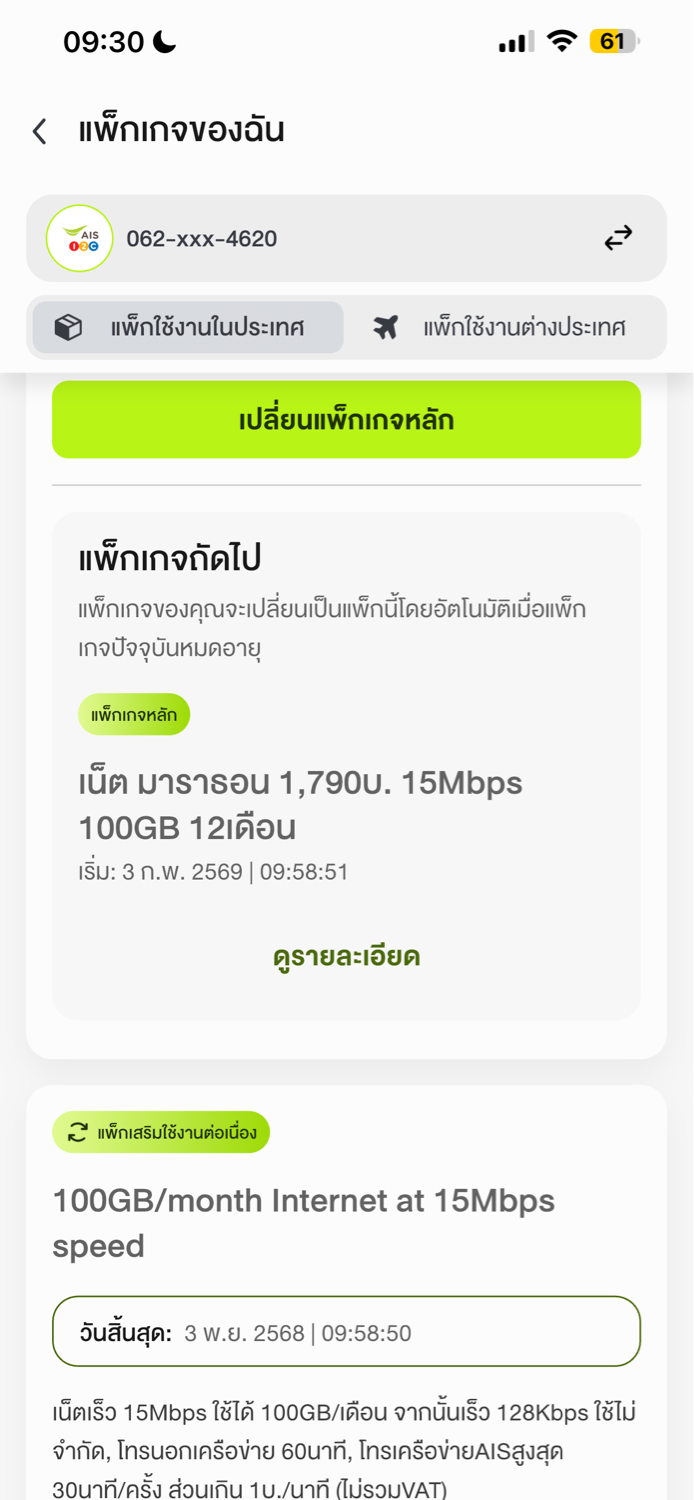 เบอร์ AIS 2 เบอร์ ใช้แพ็คเกจรายปี AIS 2 ปี เน็ต 15 Mbps 100 GB/เดือน มีโทรนอกเครือข่าย 60นาที/เดือน โทร AIS 30 นาที/ครั้ง 24 ชม ราคา 1790 บาท พอปีที่ 3 ให้เน็ตเท่าเดิม ราคาเดิม แต่ไม่มีโทรอะไรให้เลย ตัดโทรออกทั้งหมด