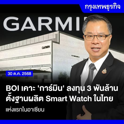 ช่วงนี้ข่าวการลงทุนในไทยเริ่มกลับมาคึกคักอีกครั้ง โดยล่าสุด “บีโอไอ” (สำนักงานคณะกรรมการส่งเสริมการลงทุน) ได้อนุมัติให้ บริษัท Garmin (การ์มิน) ตั้งฐานการผลิต “อุปกรณ์อัจฉริยะ” และ Smart Watch มูลค่ากว่า 3,000 ล้านบาท ที่จังหวัดชลบุรี
