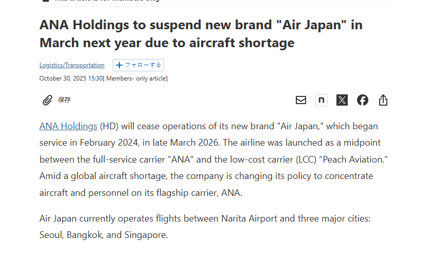 Air Japan เตรียมยกเลิกการให้บริการ ช่วงปลายมีนา 2569 โดย ANA ให้เหตุผลว่า เครื่องบินไม่เพียงพอกับการใช้งาน
