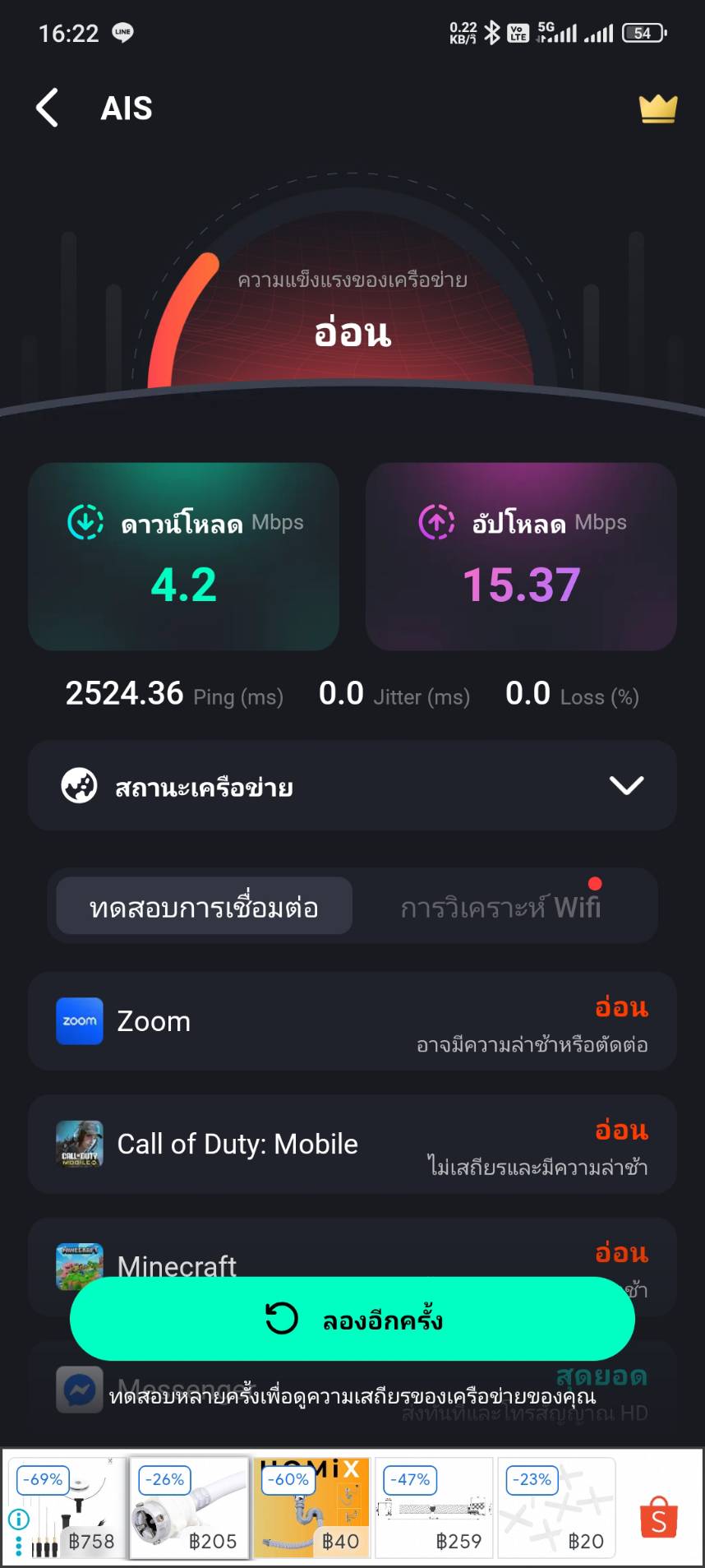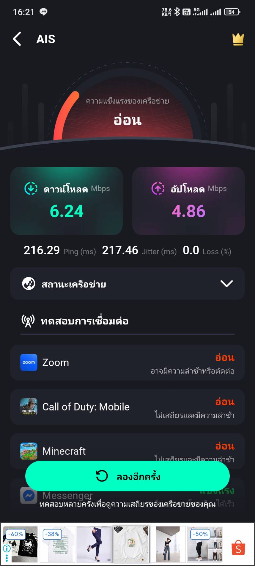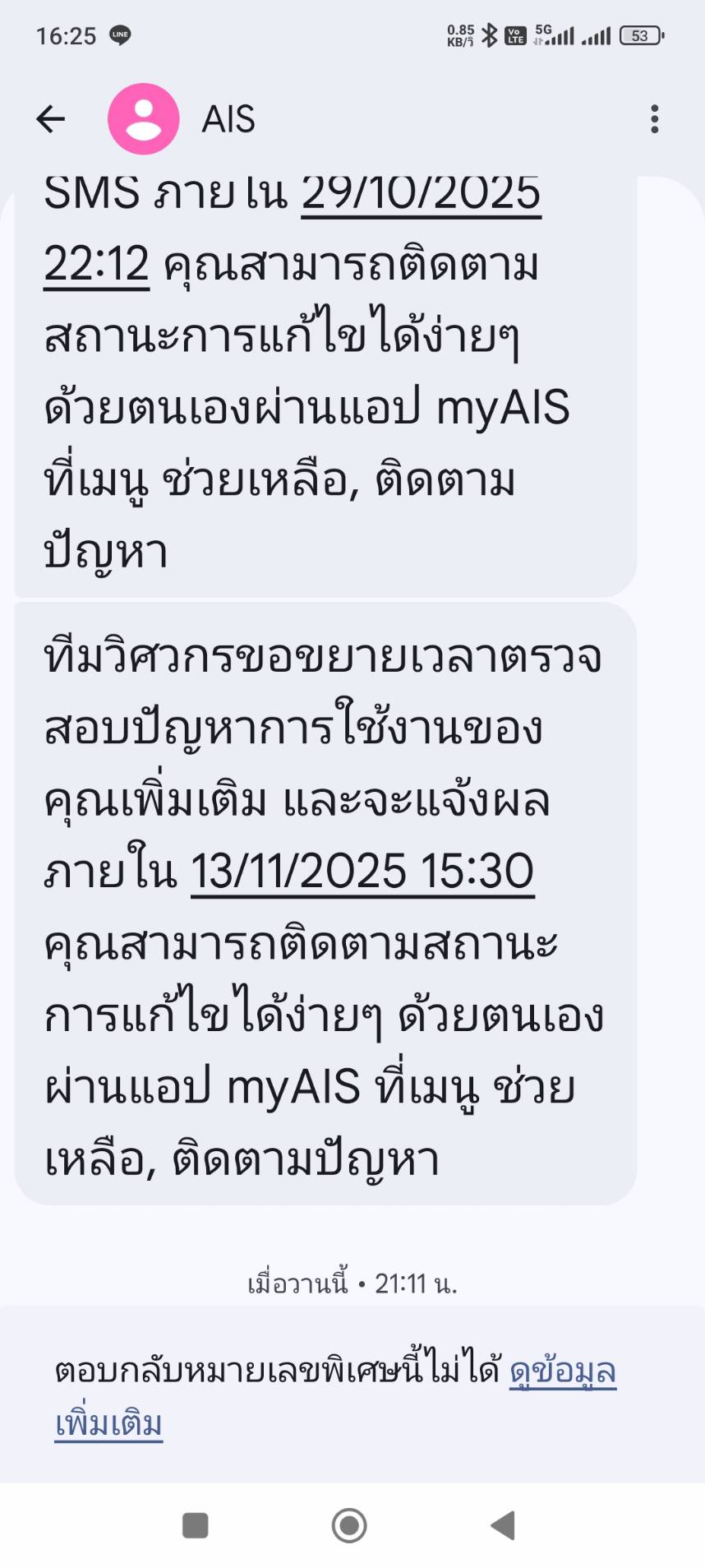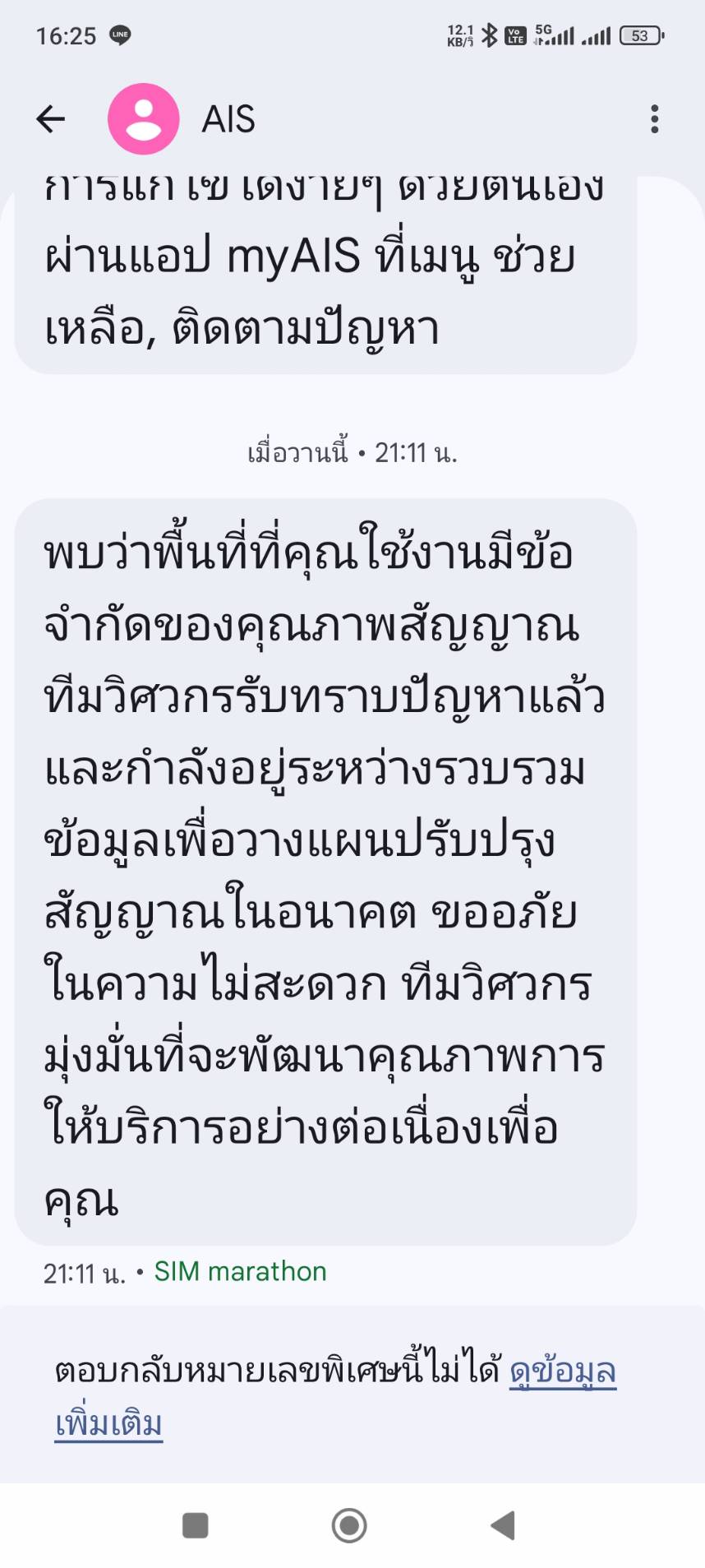 ใช้ซิมเน็ต AIS marathon max ความเร็ว15 Mbps ไม่เกิน 50 GB/เดือน เน็ตช้ามากๆ ขนาดเข้าแอปธนาคารจะสแกนจ่าย แต่จ่ายไม่ได้ เปิดปิดไหม่ก็เหมือนเดิมเป็นบ่อยมากๆ ยิ่งเดินทางต่างพื้นที่ เหมือนต้องเปิดปิดใหม่ แต่ก็ยังช้า ล่าสุดคือเมื่อวานไปซื้อกับข้าวแล้วไม่ได้พกเงินสดเลย เลยสแกนจ่าย เปลี่ยนแอปธนาคารทุกแอปทีมีแล้ว เปิดปิดเน็ตก็แล้ว เกือบครึ่งชั่วโมงเน็ตก็ใช้ไม่ได้แต่สัญญาณเต็มแถมขึ้น 5G อีก เลยเข้าแอปเอไอเอสเพื่อจะแจ้งปัญหาแต่ก็เข้าไม่ได้ ทั้งๆ ที่เสาสัญญาณอยู่ใกล้ๆ ด้วยซ้ำ กลับถึงบ้านเลยใช้ WiFi แจ้งปํญหาที่แอปเอไอเอส เหมือนทุกครั้ง แต่รอบนี้เหมือนจะแก้ปัญหาเร็ว ไม่เหมือนก่อนหน้าที่ต้องใช้เวลา 14-15 วัน เพื่อให้วิศวะกรแก้ปัญหา แต่ไม่กี่นาทีมีข้อความเข้ามาแจ้ง;jkทีมวิศวกรขอขยายเวลาตรวจสอบปัญหา สรุปแล้วไม่ต่างกันเลย 14-15 วันเหมือนเดิม พอมีปัญหาอีกก็ 14-15 วัน ยาวๆ จะได้งานเน็ตปกติตอนไหน เพราะ 15 Mbps ที่ซื้อเทสสปีดได้ไม่เคยถึง 5 Mbps ซักครั้ง ทั้งๆ ที่ก่อนหน้านี้ประมาณ 6 เดือนใช้รายเดือนเอไอเอสเน็ตเต็มสปีดแต่ไม่เกิน 30 GB/เดือน ไม่เคยเจอปัญหานี้เลย เลยเริ่มรู้สึกไม่ค่อยจะดีกับค่ายนี้แล้ว
