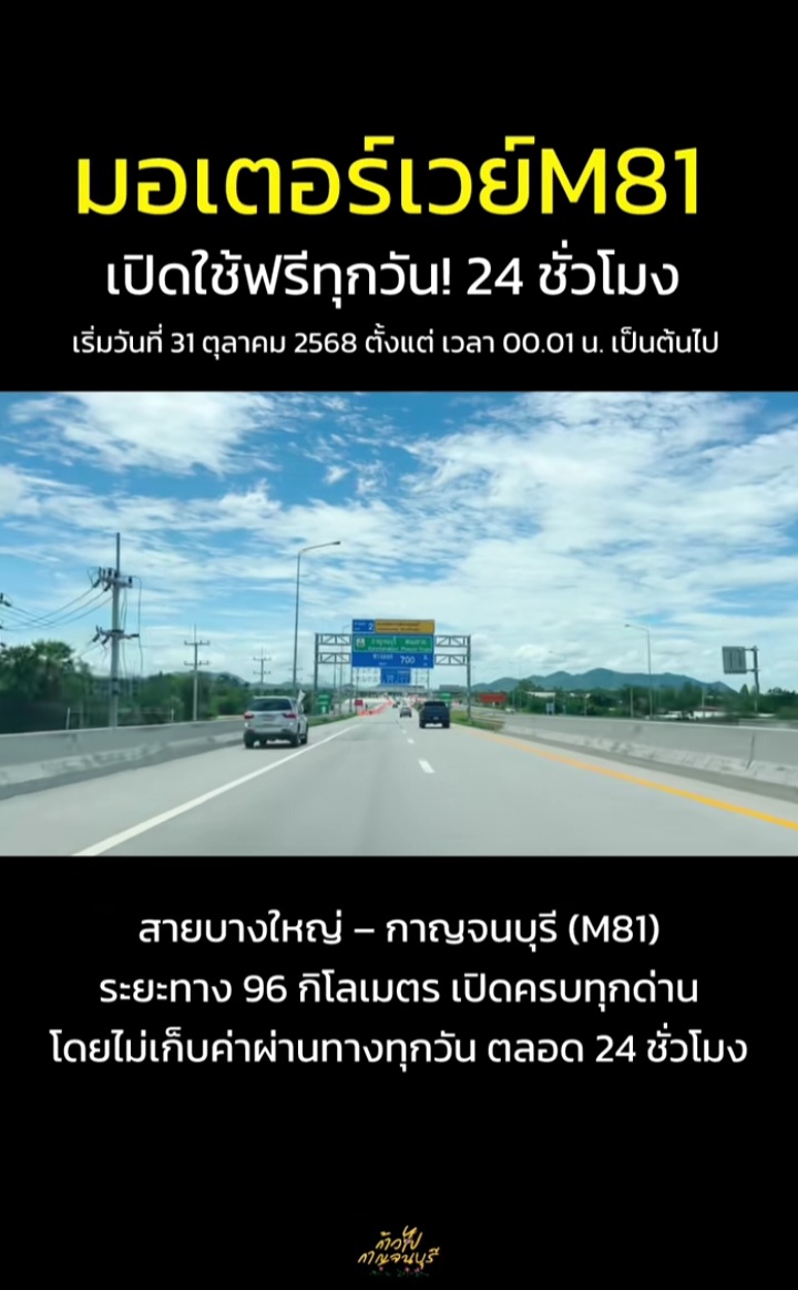📍มอเตอร์เวย์ M81 สายบางใหญ่ – กาญจนบุรี เปิดใช้ฟรีทุกวัน! 24 ชั่วโมง เริ่ม 31 ตุลาคมนี้ 🚗