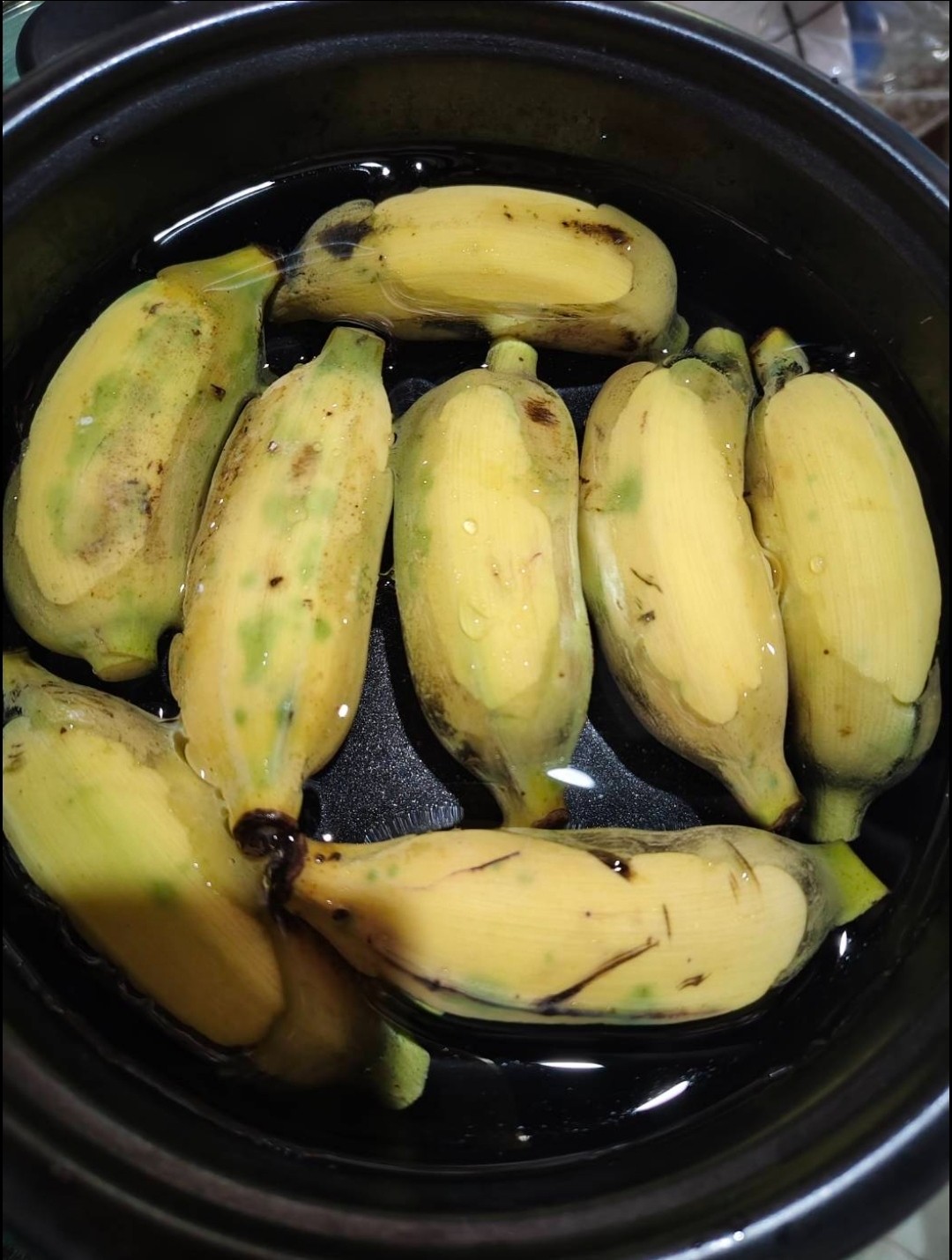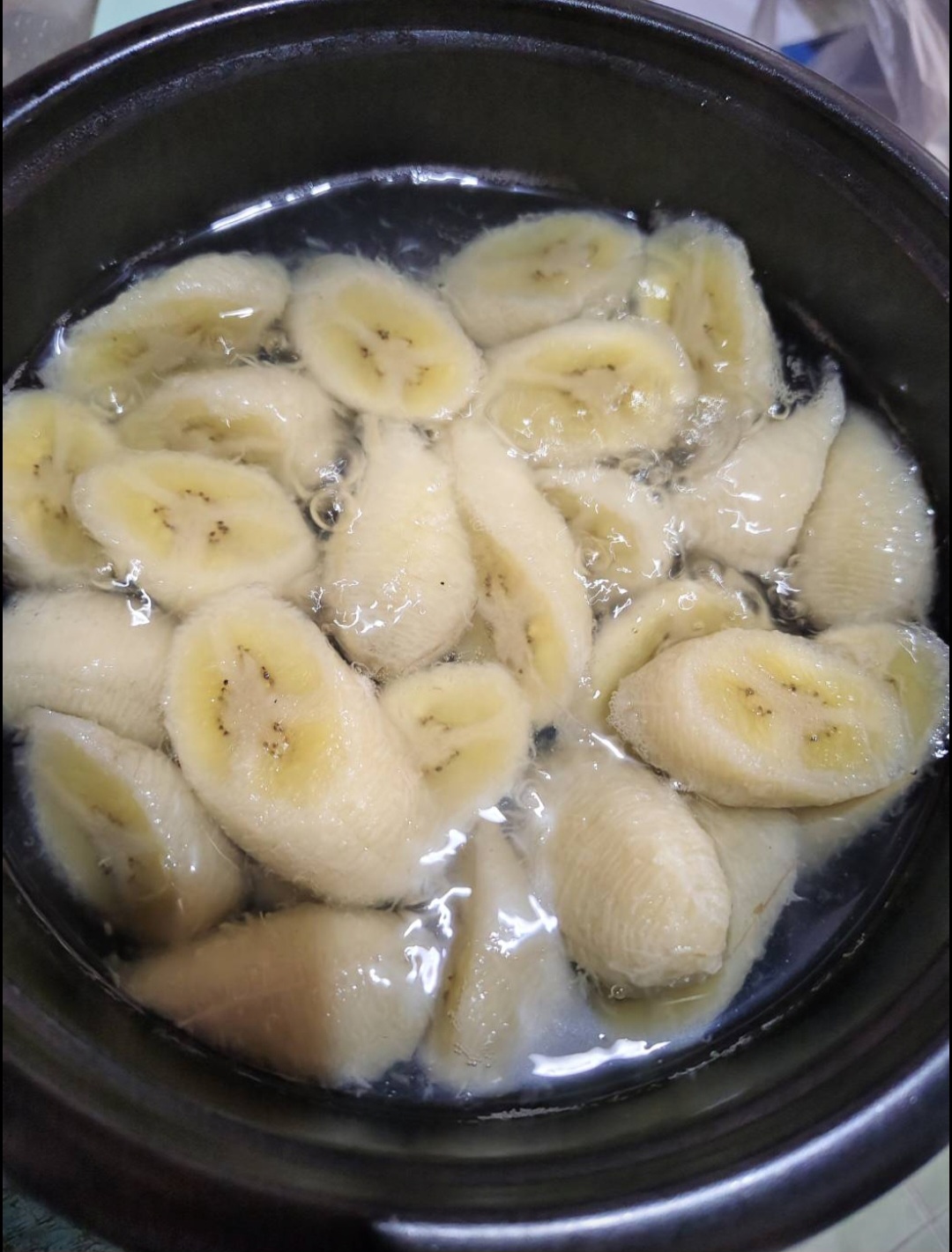 เริ่มจาก นำกล้วยใส่หม้อไฟฟ้า ต้มจนสุกเสียก่อน