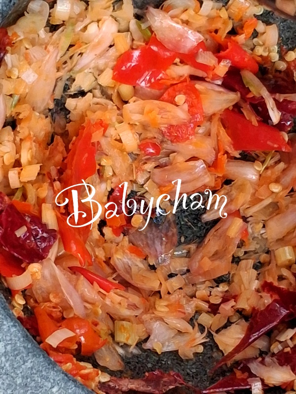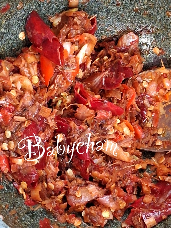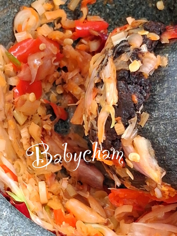 แล้วก็ใส่กะปิลงไป ตำรวมๆเข้ากันสักหน่อย
