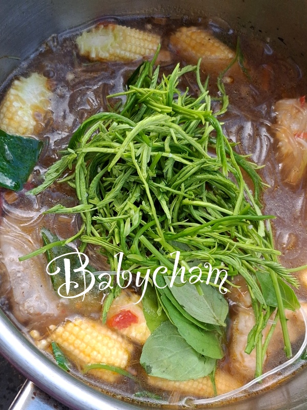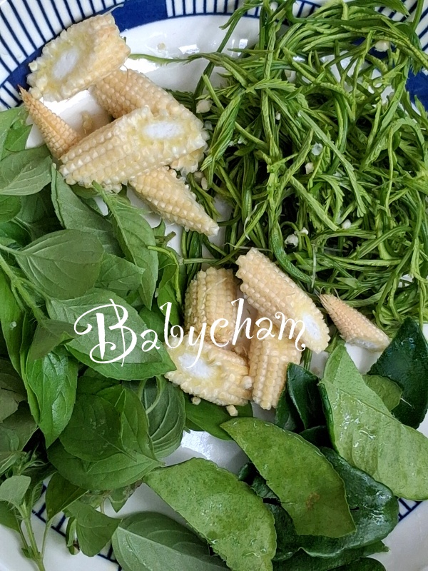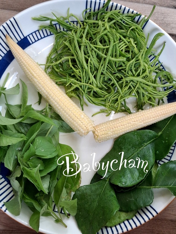 10.ผักที่จะใส่ ชะอม ข้าวโพด เห็ดฟาง ใบแมงลัก ใบมะกรูด
