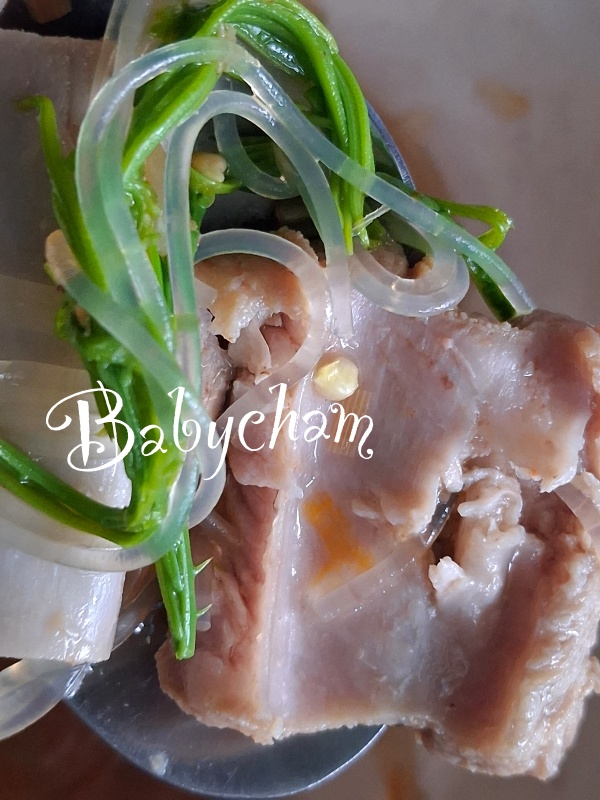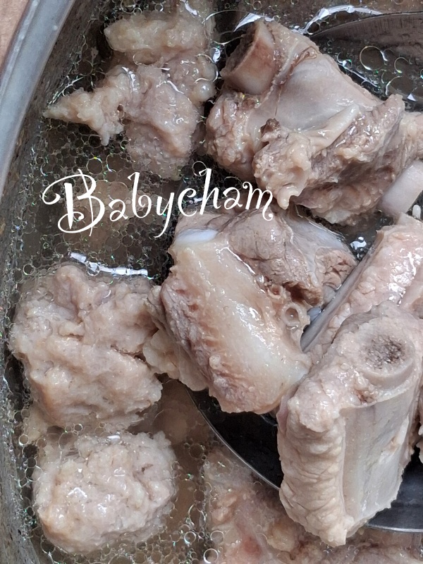 กระดูกหมูนำมาล้างด้วยเกลือ และล้างอีกครั้งด้วยน้ำเปล่า แล้วนำไปต้มไฟอ่อนๆ สัก 30-40 นาที ให้เนื้อนุ่ม เปื่อยร่อนจากกระดูกสักหน่อย