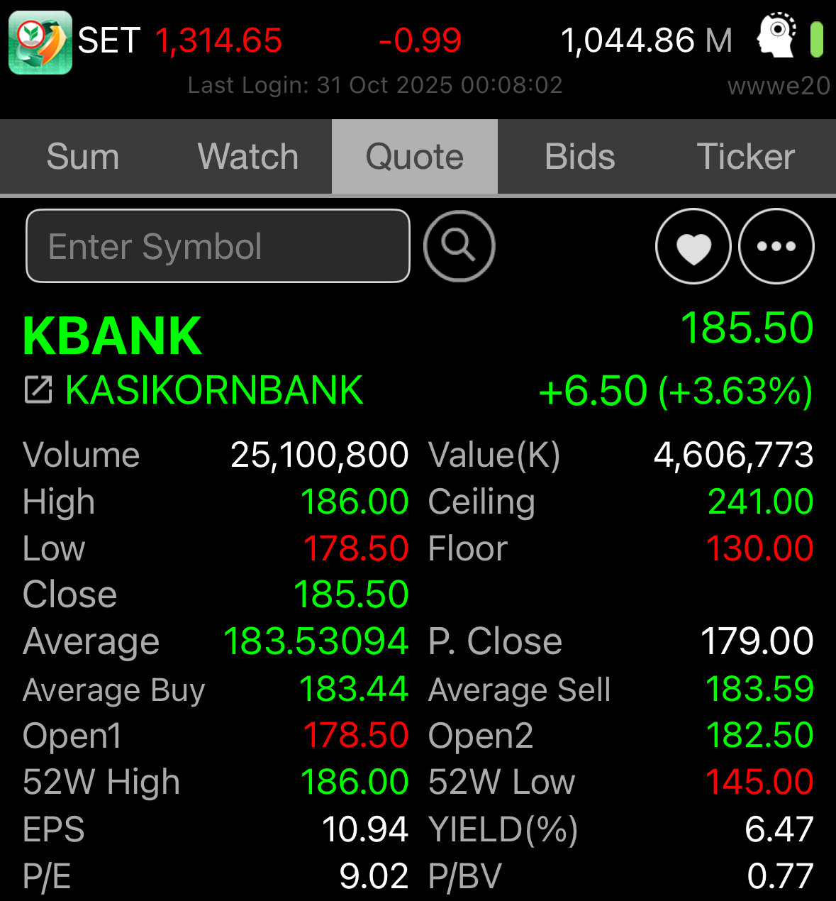 วันนี้ 25/10/2023 ดัชนี SET Index 1410 จุด กองทุนซื้อหรือเปล่า มีแรงซื้อหุ้นกลุ่มธนาคาร KBANK SCB BBL ส่วน DELTA AOT ก็เปิดบวก ไม่รู้ว่าพวกกองทุนมาซื้อเพิ่มหรือเปล