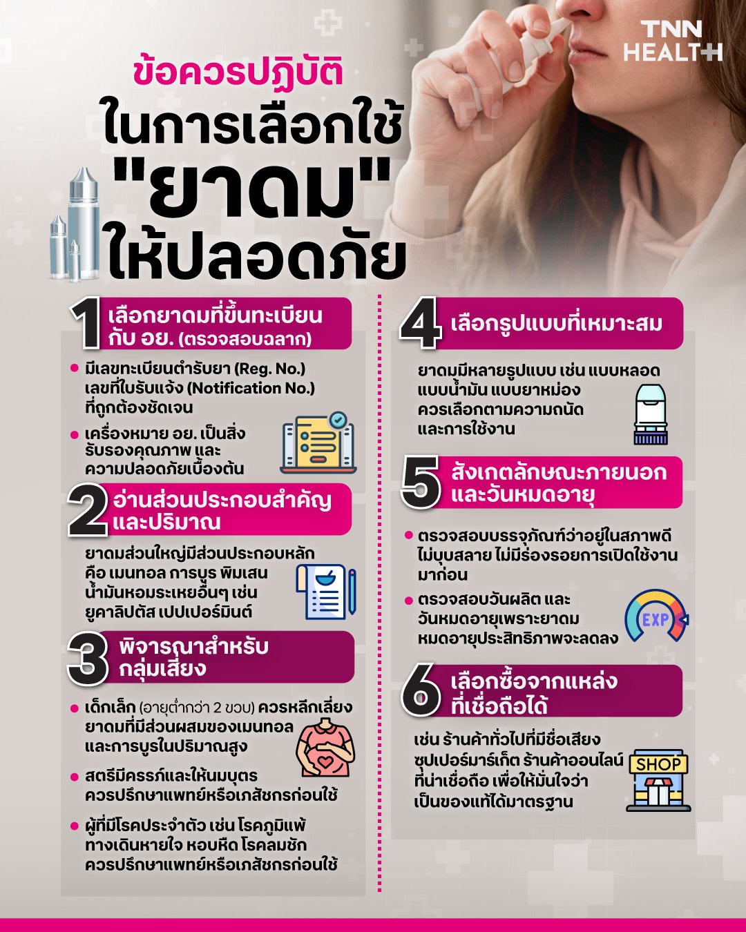 การเลือกใช้ยาดมให้ปลอดภัยนั้นสำคัญ เพื่อให้ได้ประโยชน์และหลีกเลี่ยงอันตราย โดยควรเลือกดังนี้