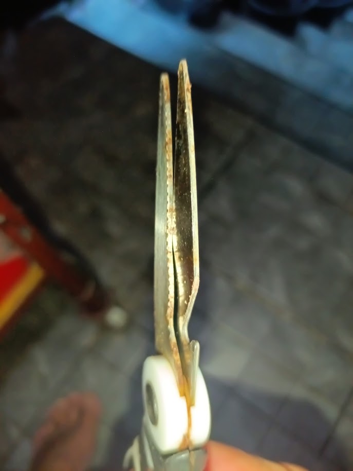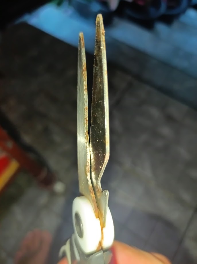 ดูที่น๊อตที่จุดหมุนของกรรไกรก่อน บางครั้งพอใช้ๆกรรไกรไป น๊อตที่จุดหมุนคลายตัว ก็จะทำให้ช่องว่างระหว่างก้านตัดสองข้างห่างขึ้น ก็จะทำให้กรรไกรตัดชิ้นงานไม่ขาด