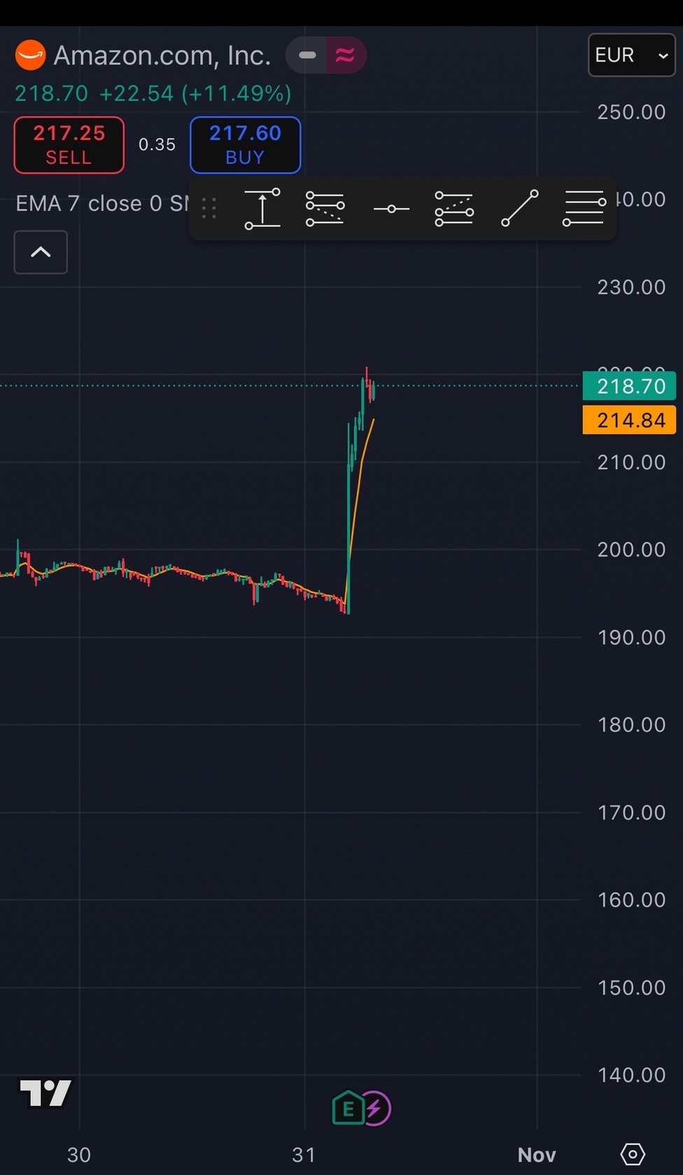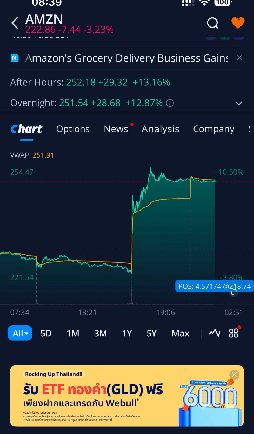 แต่พอไปเปิด กร๊าฟ ดูใน Tradding veiw เอ๊ะทำไม Amazon ในตลาด NASDAQ ที่เรา เทรดใน Webull ถึงยังหัวทิ่มไม่สูง