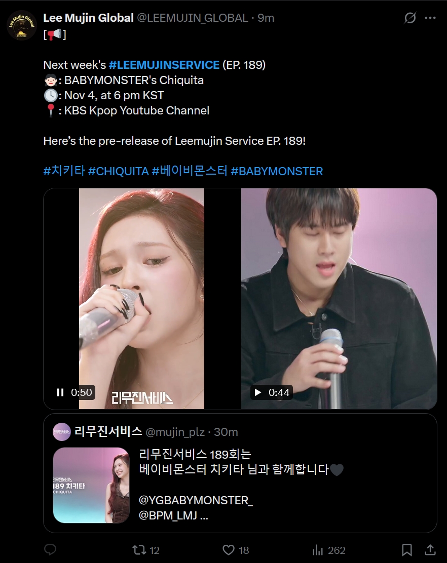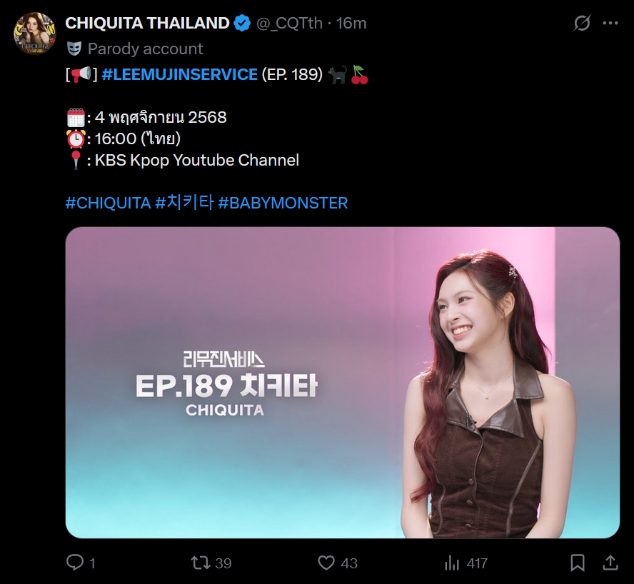 Babymonster : ชิกิต้าจะไปร่วมรายการ LEEMUJIN SERVICE (EP. 189) 🐈⬛🍒 🗓️: 4 พฤศจิกายน 2568 ⏰: 16:00 (ไทย)