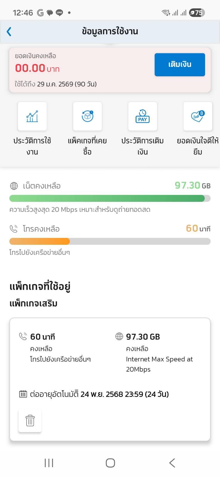 ผู้ใช้บริการเติมเงินมือถือวันที่ 06/10/2568 21:23 น. เป็นจำนวนหนึ่ง รวมกับยอดเดิมจำนวนหนึ่ง เป็นมูลค่าเพียงพอต่อการต่อรอบโปรฯเสริม ตามที่ระบุใน sms วันที่ 30/10/68 23:59 น. โดยผู้ใช้บริการได้ดำเนินการ
