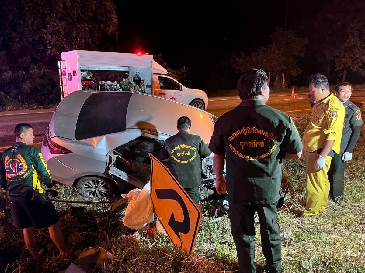 สยอง! หนุ่มขับเบนซ์ ไปเช็งเม้ง - ชนรถพ่วง ไฟลุกท่วม ดับคาซาก อ.พรหมพิราม จ.พิษณุโลก