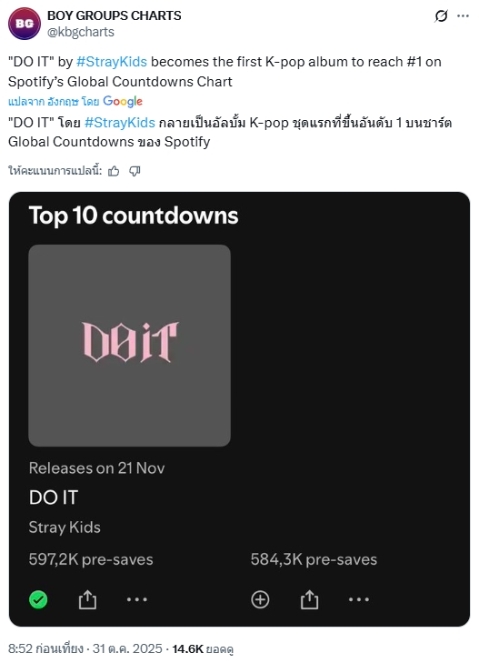 🔥 Stray Kids "DO IT" กลายเป็นอัลบั้ม K-pop อัลบั้มแรกที่ขึ้นสู่จุดสูงสุดอันดับ 1 บนชาร์ต Global Countdowns ของ Spotify