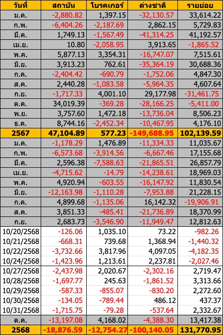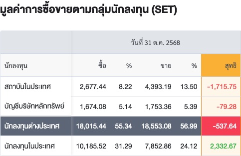 Sinthorn Summary 31/10/2568 : ต่างชาติขายสุทธิ -537.64 ลบ.