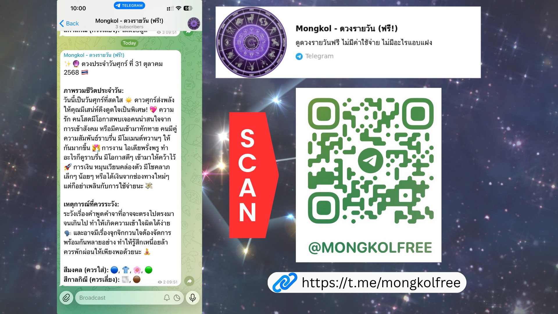 หากมี Telegram แล้วก็ตามได้เลย ฟรี ไม่มีอะไรแอบแฝง ไม่มีโฆษณาอะไร อ่านดวงไปล้วนๆ ยาวกว่าข้อความที่ขาย 4 บาทแน่นอน 👉 https://t.me/mongkolfree