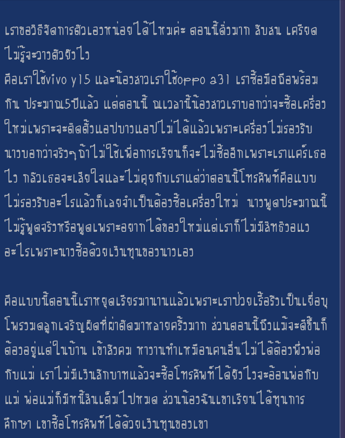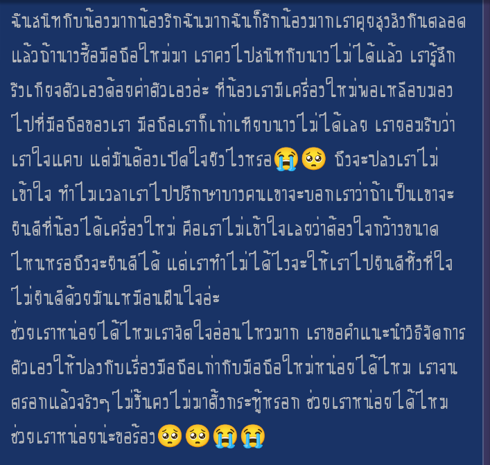บางทีก็รู้สึกว่าไม่มีใครเข้าใจเรา เพราะบางปัญหา ก็ยากที่จะผ่านมาได้ ตอนนี้ก็สบายแล้วค่ะ ขอโทษด้วยนะคะ