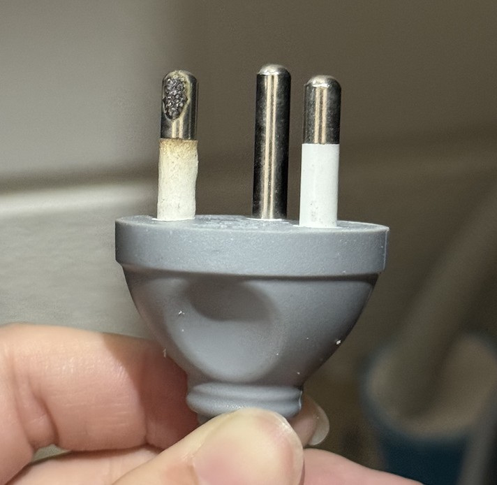 หลังจากนั้นก็ยังใช้ไปเรื่อย ๆ ตามคำแนะนำช่างค่ะ จนวันหนึ่งที่เครื่องซักผ้าดับอีก เลยลองถอดปลั๊กมาดู เจอว่าปลั๊กไหม้ และหลอมไปจนถึงแกนปลั๊กแล้ว