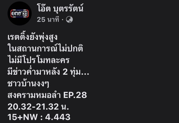 เรตติ้ง ละคร สงครามหมอลำ พฤ. 30 ต.ค. ยังแกร่ง ได้ไป (ออน 20.30 น.)