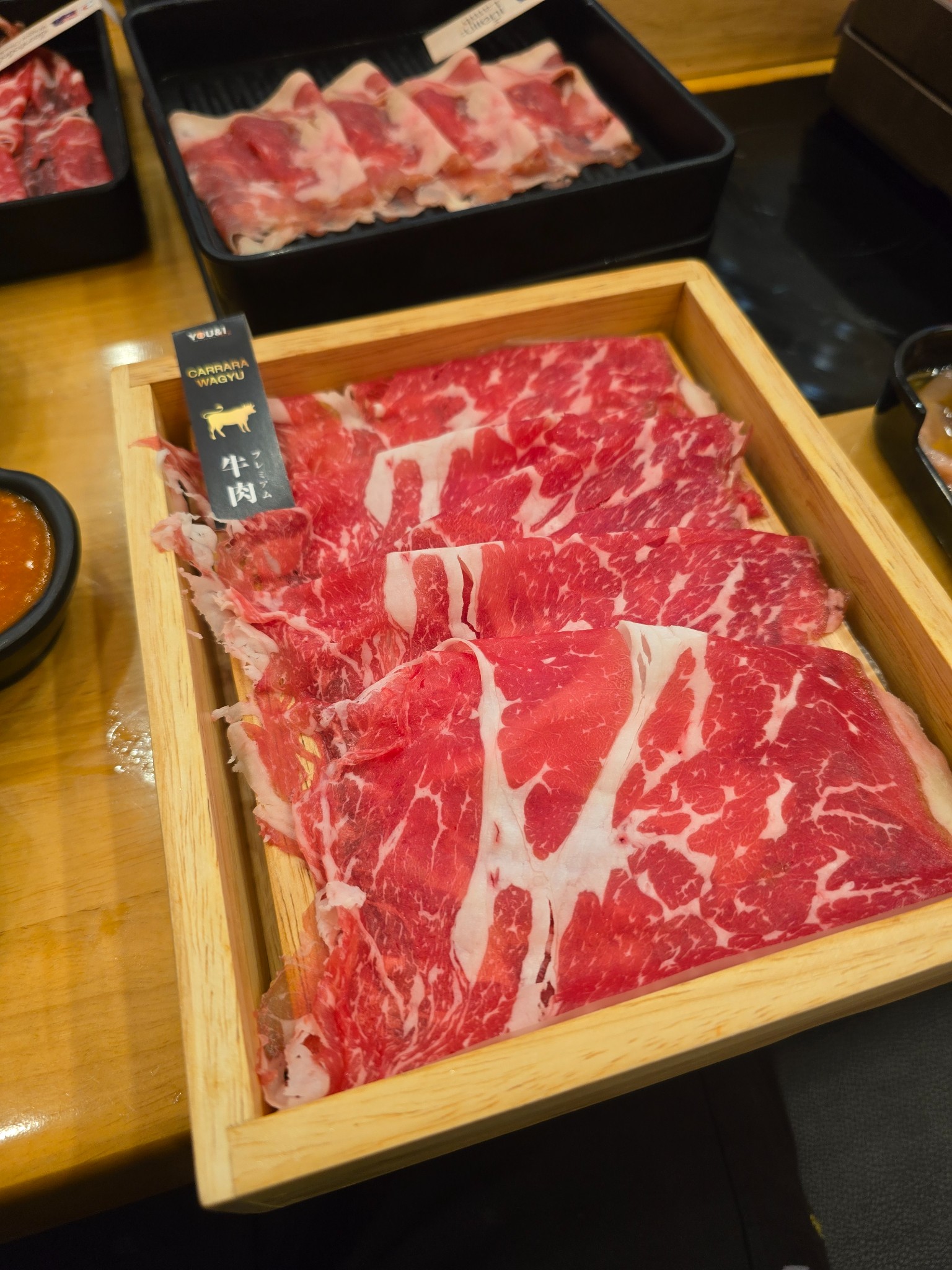 Carrara Wagyu: ตัวนี้ถือว่าดีรองลงมาครับ ลายมันแทรกจะน้อยกว่า A4 แต่ชิ้นกำลังดี มีกลิ่นเนื้อชัดเจน ถือว่าอร่อยใช้ได้เลยครับ