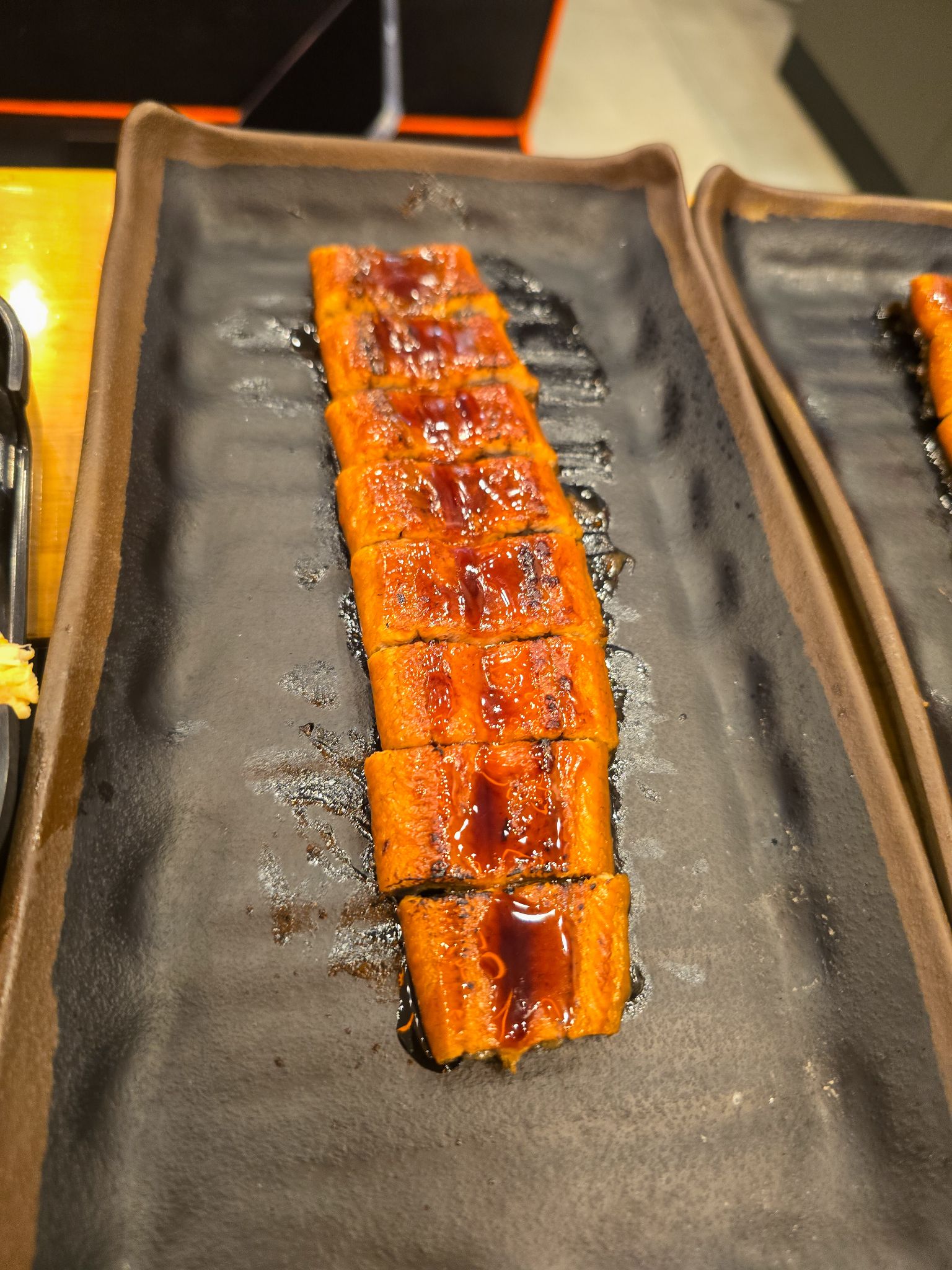 ปลาไหลย่างซีอิ๊ว (Unagi): เนื้อปลาไหลนุ่มดี คีบแล้วไม่ขาด น้ำราดหวานกำลังพอดี (ข้อสังเกต: ทั้งเมนู Kani Miso และ ปลาไหลย่างซีอิ๊ว นี้ต้องสั่งกับพนักงานนะครับ ใน QR Code ไม่มีให้กดสั่งครับ)