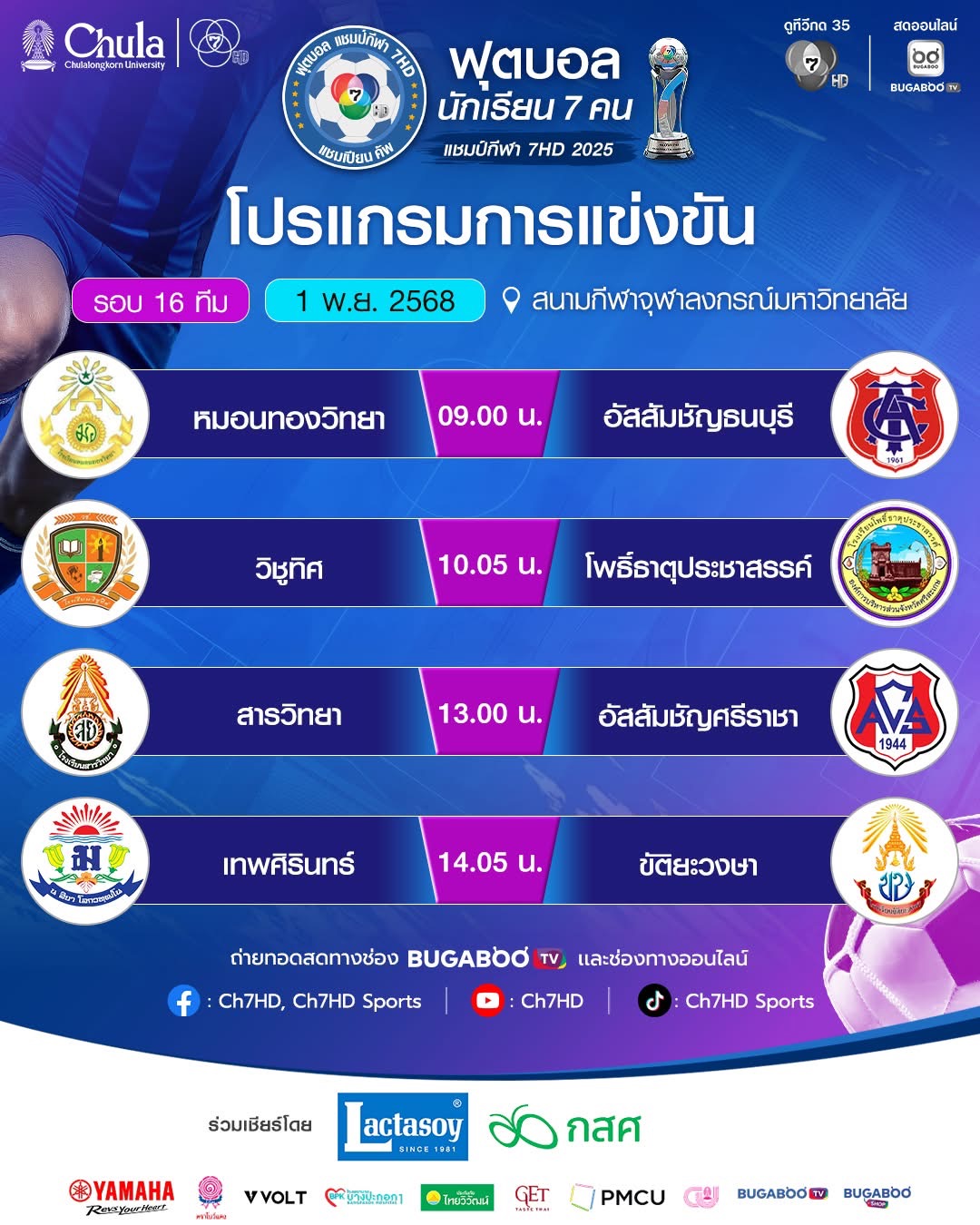 โปรแกรมการแข่งขัน ฟุตบอลนักเรียน 7 คน แชมป์กีฬา 7HD 2025 26 ต.ค 68