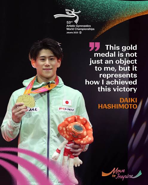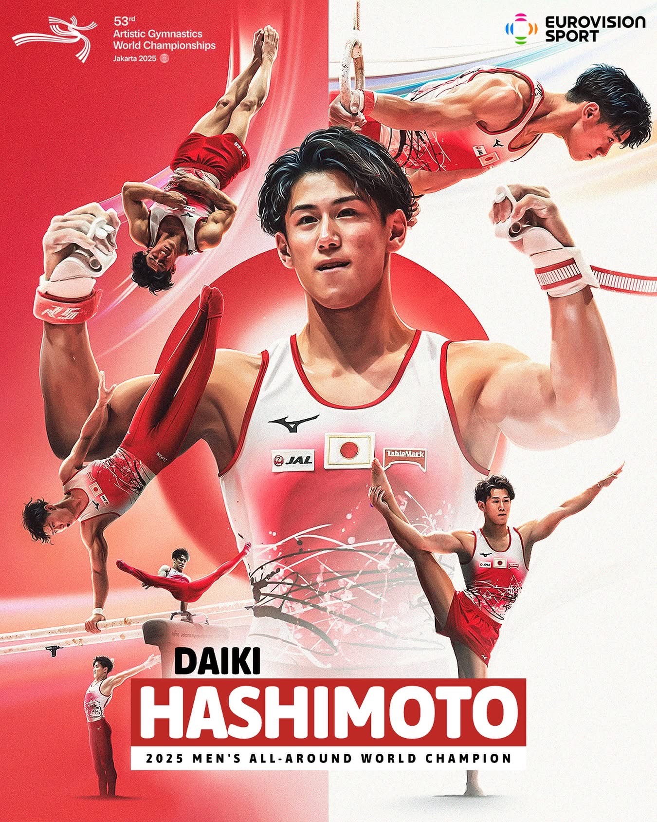 ในรายการ 53rd FIG Artistic Gymnastics World Championships 2025 หรือการแข่งขันยิมนาสติกสากลชิงแชมป์โลก 2025 ระหว่างวันที่ 19-25 ตุลาคม 2568 ที่ผ่านมานั้น Daiki Hashimoto นักยิมนาสติกหนุ่มวัย 24 ปีจากญี่ปุ่นได้สร้างประวัติศาสตร์หน้าใหม่ให้แก่วงการยิมนาสติกโลกด้วยการคว้าเหรียญทองในประเภทรวมอุปกรณ์บุคคลชายได้เป็นสมัยที่ 3 ติดต่อกันในรายการยิมนาสติกสากลชิงแชมป์โลก หลังจากก่อนหน้านี้เจ้าตัวเคยทำได้ในปี 2022 ที่ลิเวอร์พูล ประเทศสหราชอาณาจักร และในปี 2023 ที่อันท์เวิร์ป ประเทศเบลเยียมมาแล้ว ซึ่งถือเป็นการสร้างประวัติศาสตร์หน้าใหม่ให้แก่วงการยิมนาสติกสากลโลกด้วยครับ