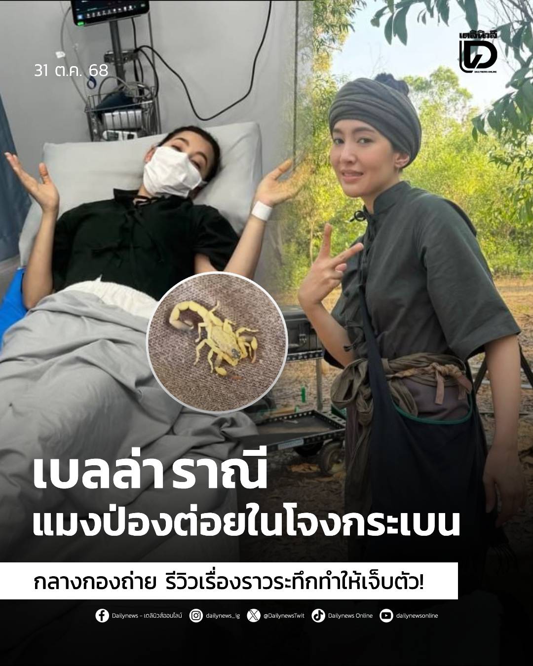 นางเอกดัง "เบลล่า ราณี" ถูกแมงป่องต่อยในโจงกระเบนกลางกองถ่าย รีวิวเรื่องราวระทึกทำให้เจ็บตัว แฟนๆ มอบกำลังใจให้ล้นหลาม..