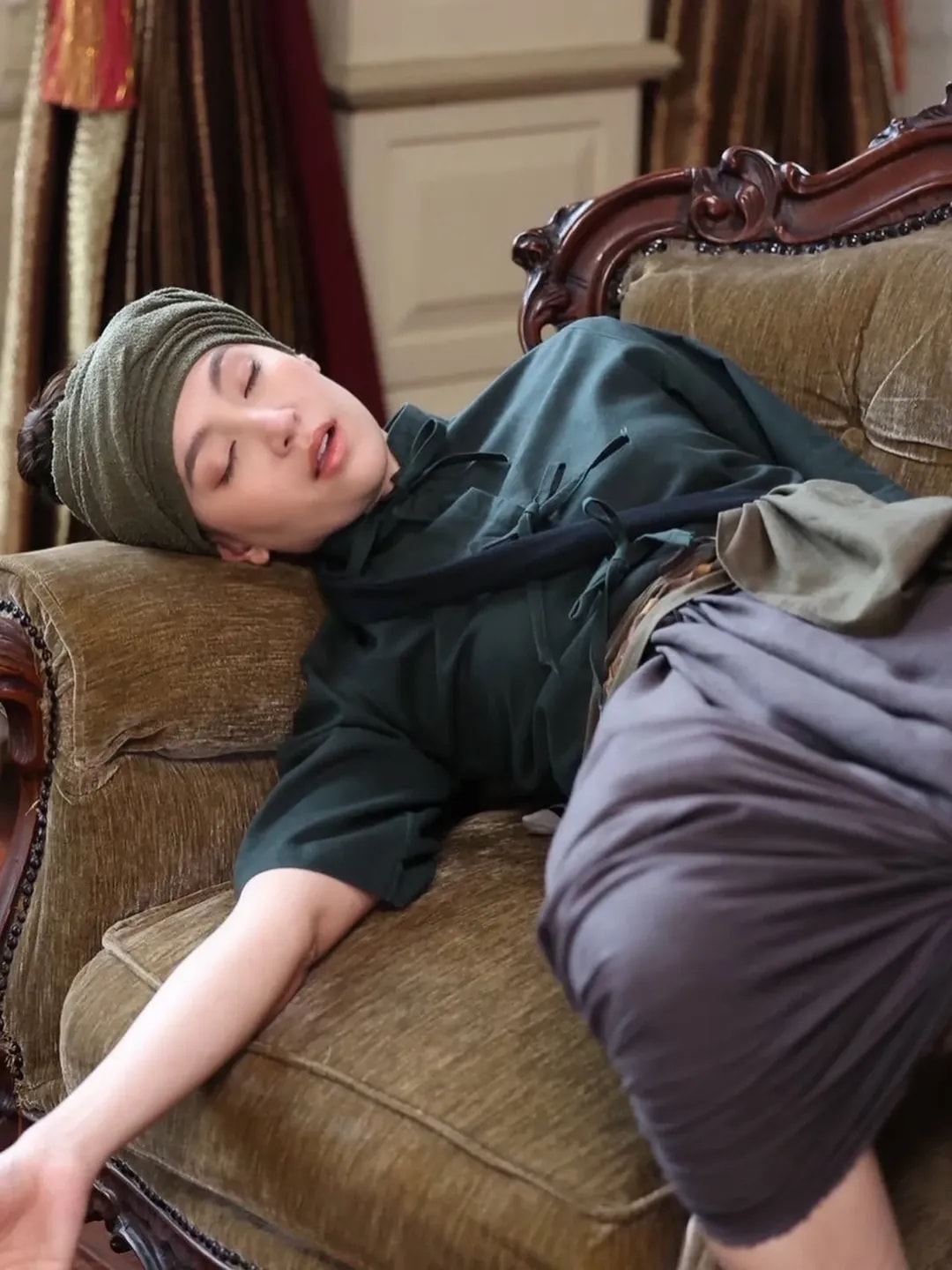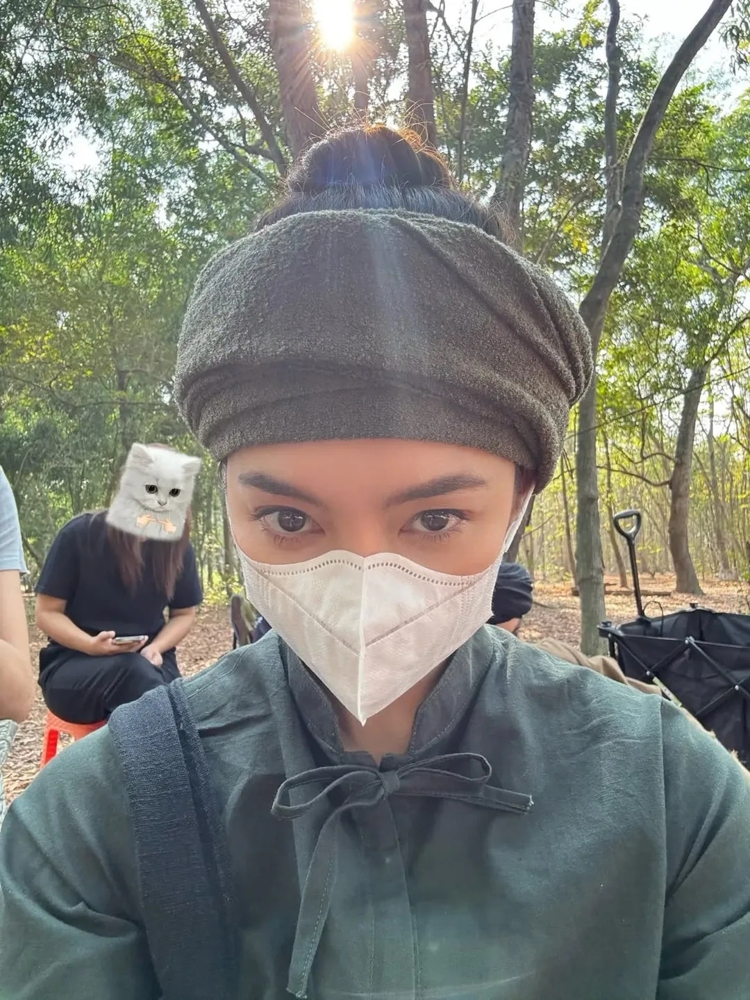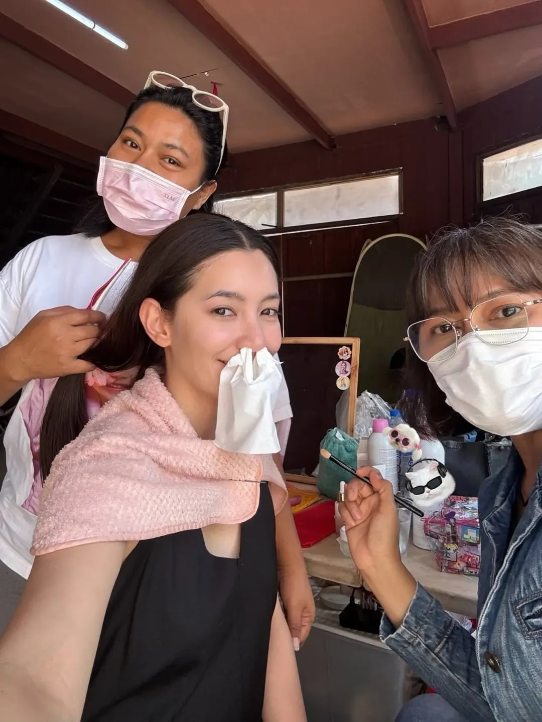 ดิชั้นเริ่มวันด้วยอาการแพ้ฝุ่นอย่างแรง เอาทิชชู่อุดจมูกให้ช่างหน้าผมแต่งองค์ไป (สภาพ..) ไปเข้าฉากก็ใส่มาส์ก แต่พอเห็นพระเอกหลับเท่านั้นแหละ จิตวิญญาณนักข่าวสาวต้องเก็บภาพมาฝากท่านผู้ชม อ่ะ ตอนเช้าถ่ายจบไป ก็พักกลางวัน