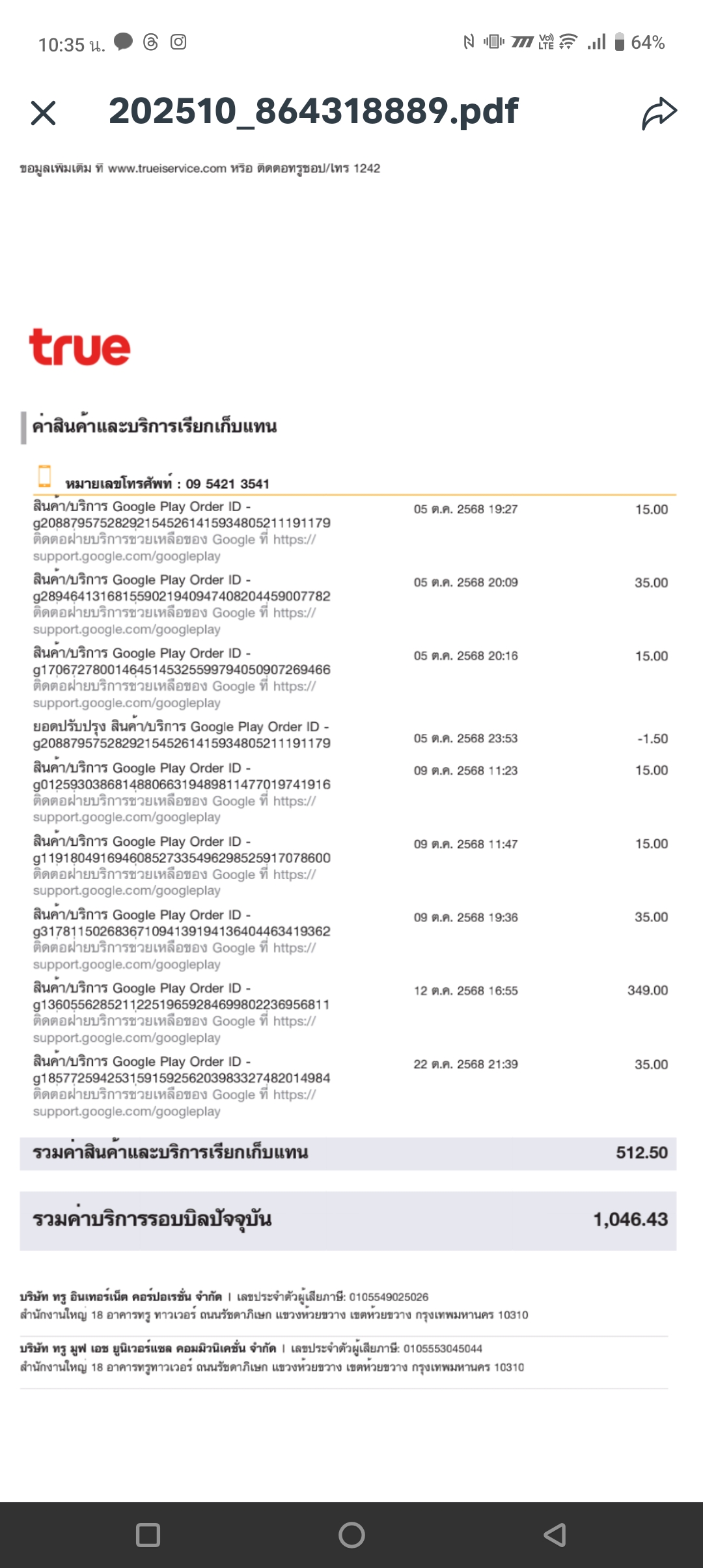 ผมถูกคิดเงินซ้ำGoogle Play Orderในเเอปทรู id