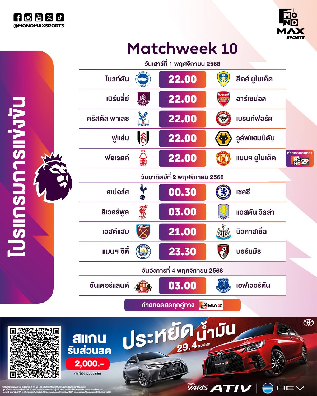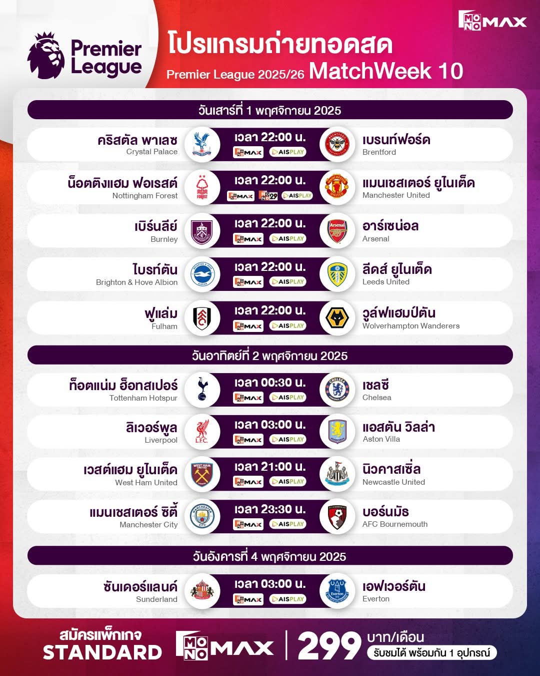 ⚽️ โปรแกรมการแข่งขัน พรีเมียร์ลีก 2025/26 สัปดาห์ที่ 10 | 🗓️ สุดสัปดาห์ของการนอนดึกได้เริ่มต้นขึ้นอย่างเป็นทางการ