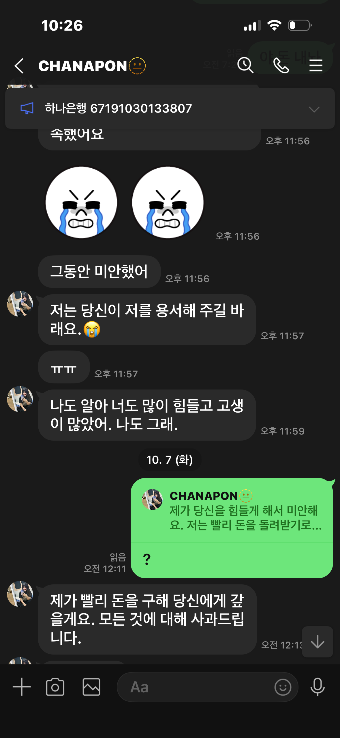 Chanaporn Srinuangam ไม่ได้เป็นหนี้อะไรผมหรอครับ? ฉันโกรธมาก แทนที่จะคืนเงินแต่ปิดกั้นการติดต่อหรอ? คิดซะว่าถ้าโดนฉันจับได้คือตายเลย ถ้าโดนตำรวจจับได้ ฉันจะขอเงินเพิ่มอีก 2 ล้านวอน เพื่อชดเชยความทรยศและความเสียหายทางจิตใจ ถ้ามอบตัวให้กับตำรวจ ฉันจะถูกสอบสวน และจบด้วยเงินที่ยืมไป 35 ล้านวอน