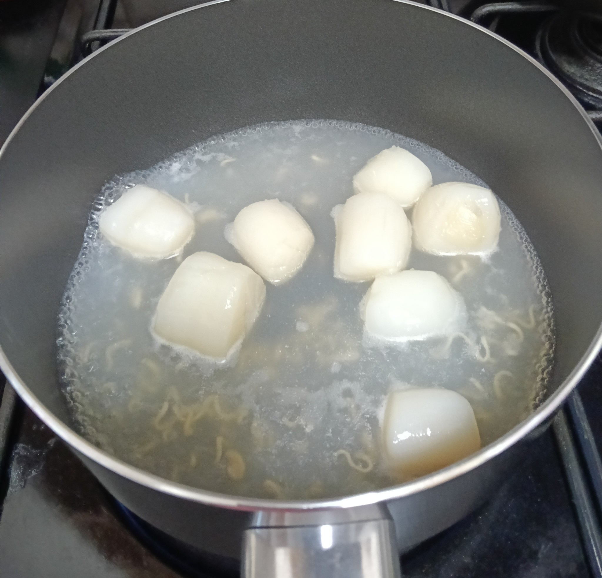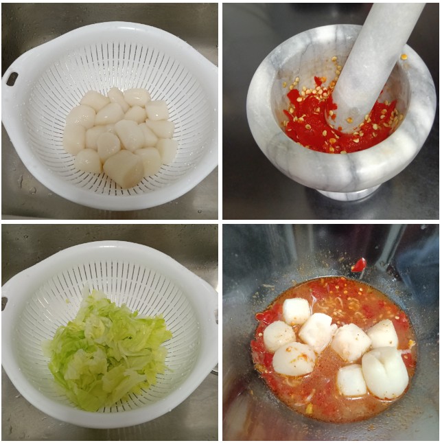 ล้างหอยเชลล์และลวกให้พอสุก ถ้าลวกนานไปหอยเชลล์จะหดตัวและเนื้อแข็งเกินไป