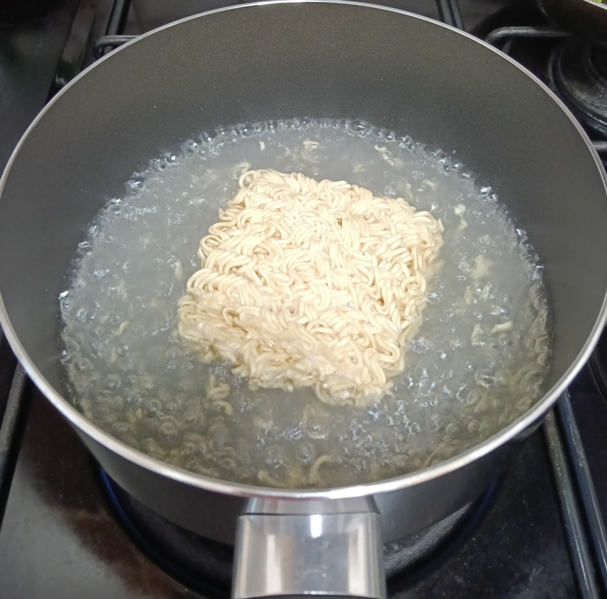 ลวกเส้นมาม่า อย่าลวกนานเกินไป เพราะเส้นจะอืดและไม่อร่อย พอเส้นสุกก็ตักเส้นขึ้นมาพักไว้
