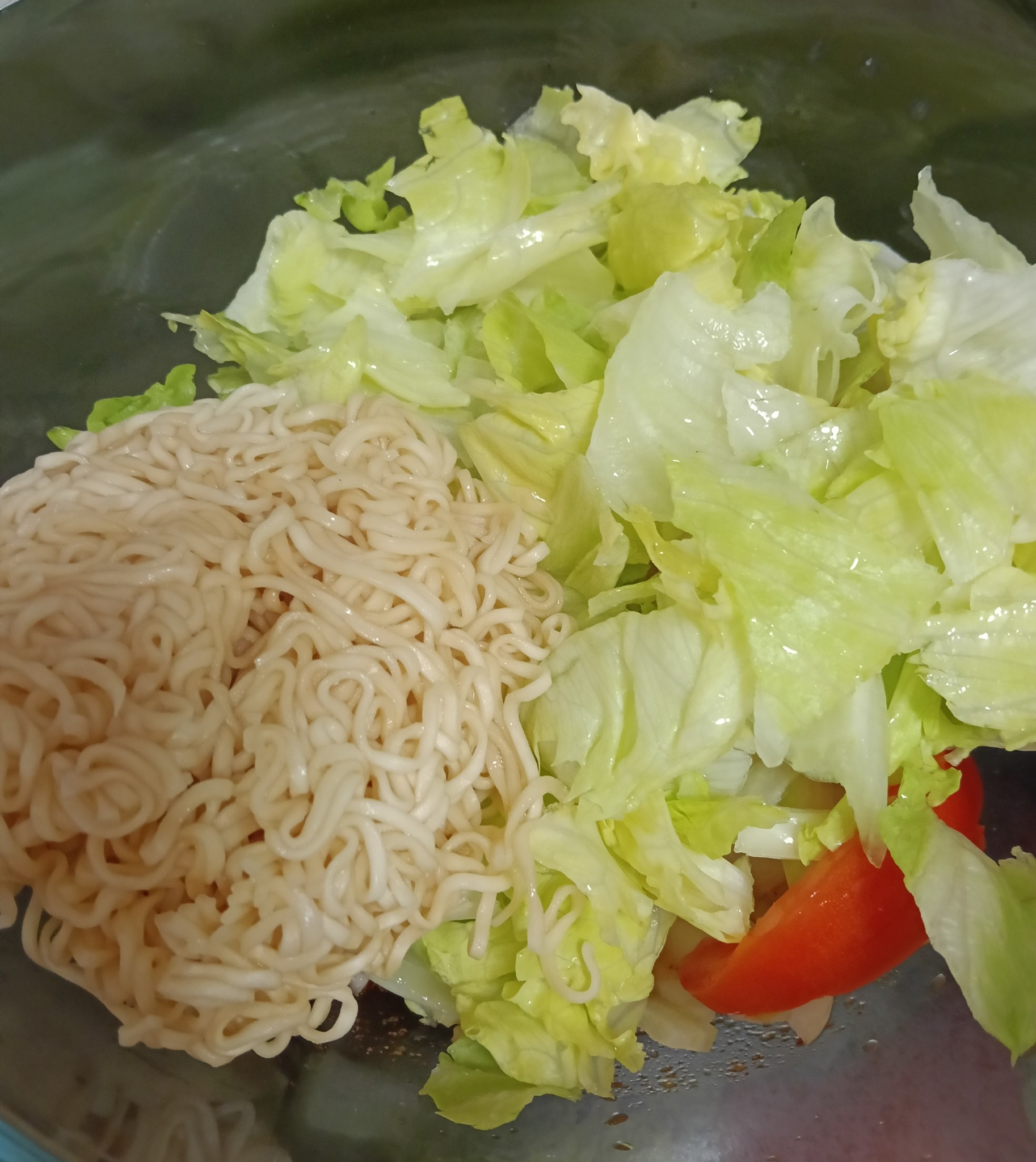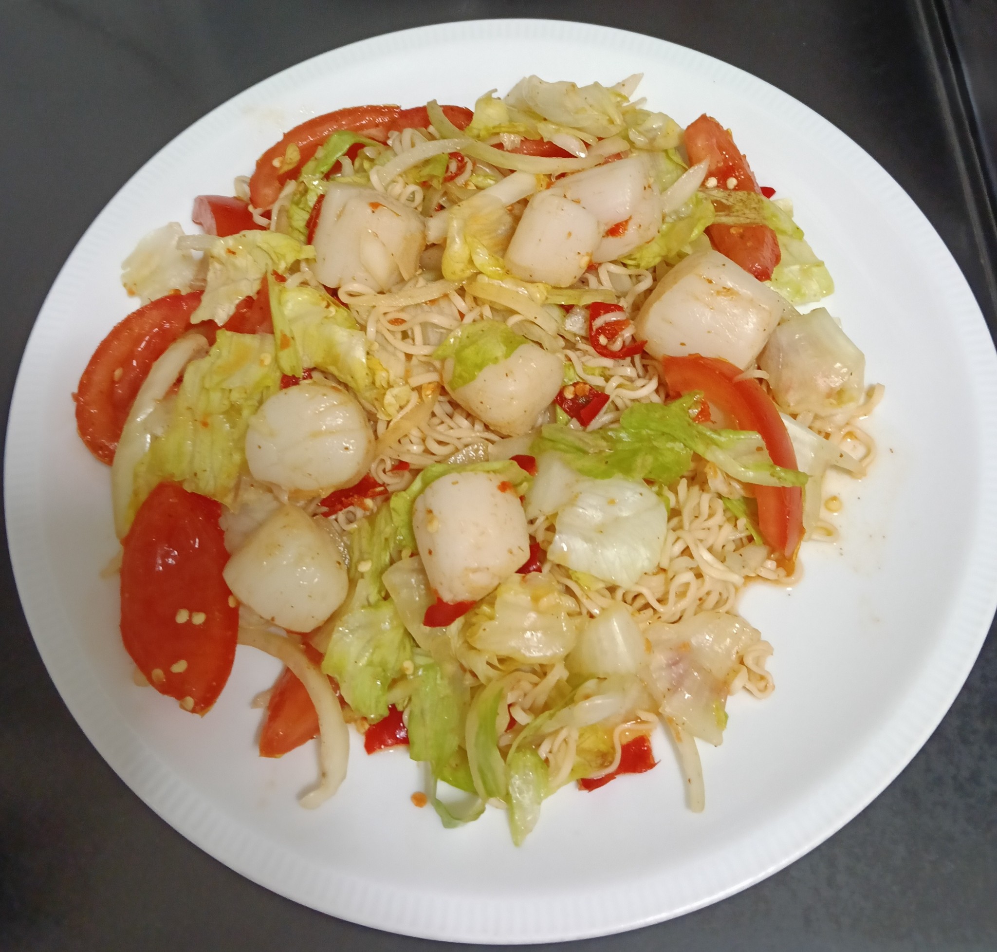 ใส่หอยเชลล์ เส้นมาม่า และผักกาดแก้ว มะเขือเทศ หอมใหญ๋ ลงไปคลุกเคล้าให้เข้ากัน แค่นี้ก็เสร็จเรียบร้อย พร้อมอร่อยแล้วค่ะ