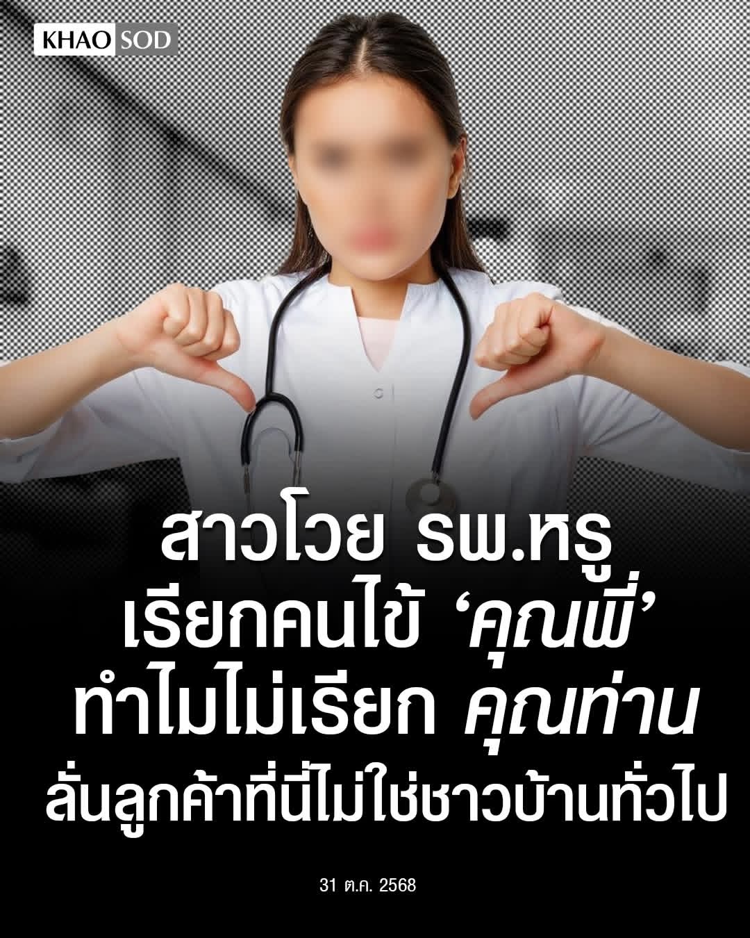 โซเชียลถกเดือด! สาวใช้บริการ รพ.เอกชน โวยถูกเรียก “คุณพี่” แทน “คุณท่าน” ชี้ไม่เหมาะกับภาพลักษณ์ระดับพรีเมียม รพ.ไม่ได้รับบัตรทอง ลูกค้าเป็นชนชั้นกลางขึ้นไป ไม่ใช่ชาวบ้านตาสีตาสา